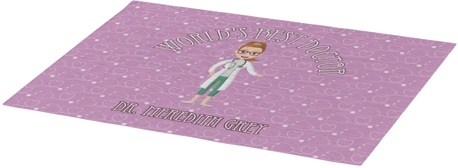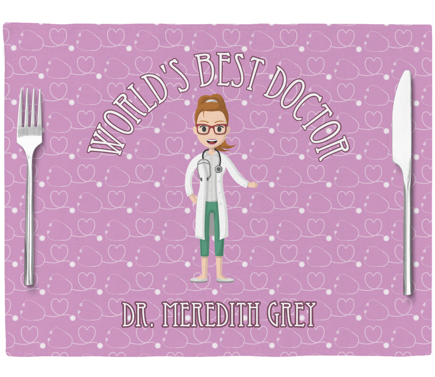 The design features an avatar doctor that is wearing a labcoat. You can easily change her hair color and skin tone. You can even swap her out for a male doctor! The background has a subtle pattern made out of stethescopes and is a fun purple. You personalization goes on top and below the avatar.