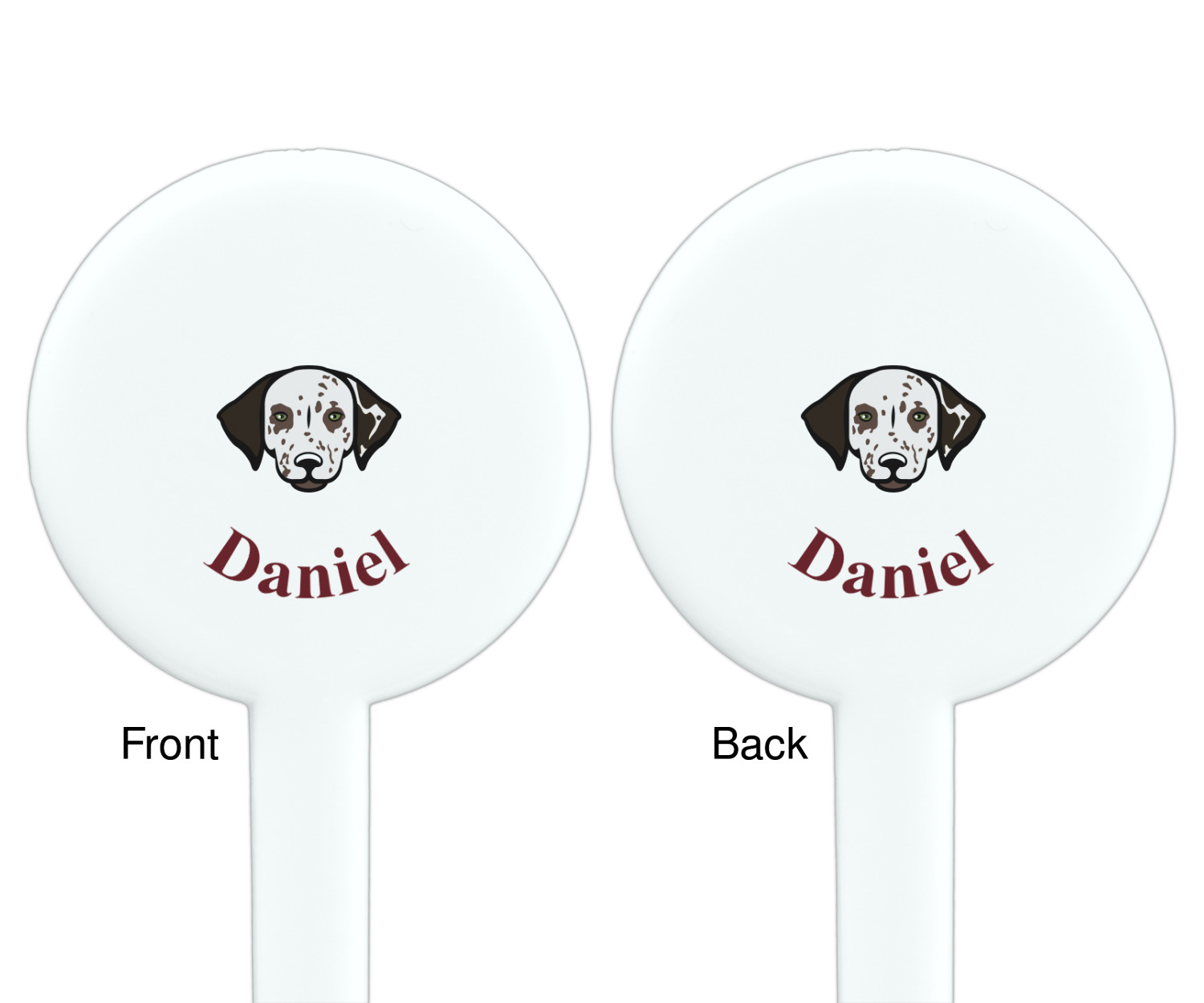 We chose a maroon ribbon with hearts and a square label. We chose the graphic and text for the label contents and featured the Dalmatian / Terrier face along with a name to personalized it.