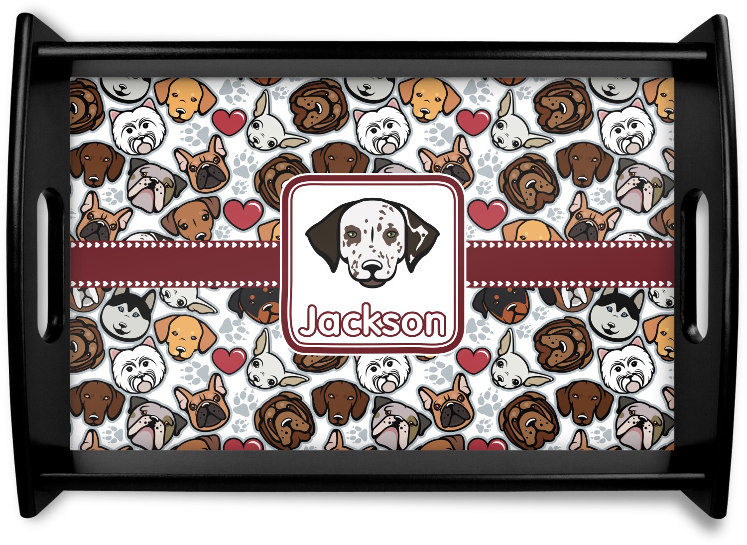 This serving tray with handles features square edges and two rounded sides, creating a very modern look. Each side is fabricated from a beautifully cut, natural wood. The bottom of the interior of the tray displays your customized design in bright, vibrant color. The tray is sold in both a black color and a natural wood look. Each variation of the wood serving tray has two sizes: Small, which is 14" x 10" x 2.25", and Large, which is 19.5" x 13.5" x 2.75".