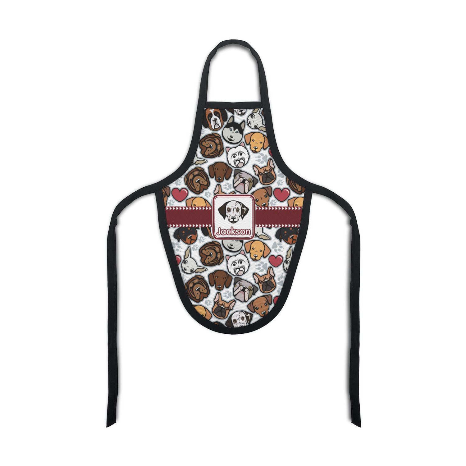 We chose a maroon ribbon with hearts and a square label. We chose the graphic and text for the label contents and featured the Dalmatian / Terrier face along with a name to personalized it.