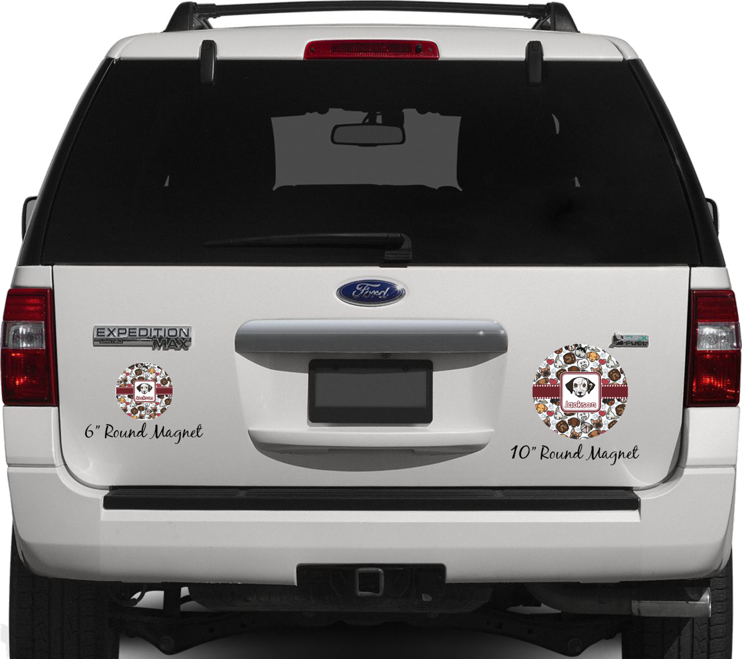 Your personalized car magnets are available for purchase in two shapes and two sizes. We carry round and square editions; each shape can either be 6 by 6 inches, or 10 by 10 inches, depending on your needs. Both versions are 1 millimeter thick, which is considered, within the industry, as the ideal thickness for automobile magnets. The magnetic car decals will adhere to any smooth, metal surface of your cars body, such as the trunk door or a side panel. However, please note that some vehicles are constructed from fiberglass bodies, which prevents the adhesion of anything magnetic. We advise that you test your vehicle before purchasing these magnets.
