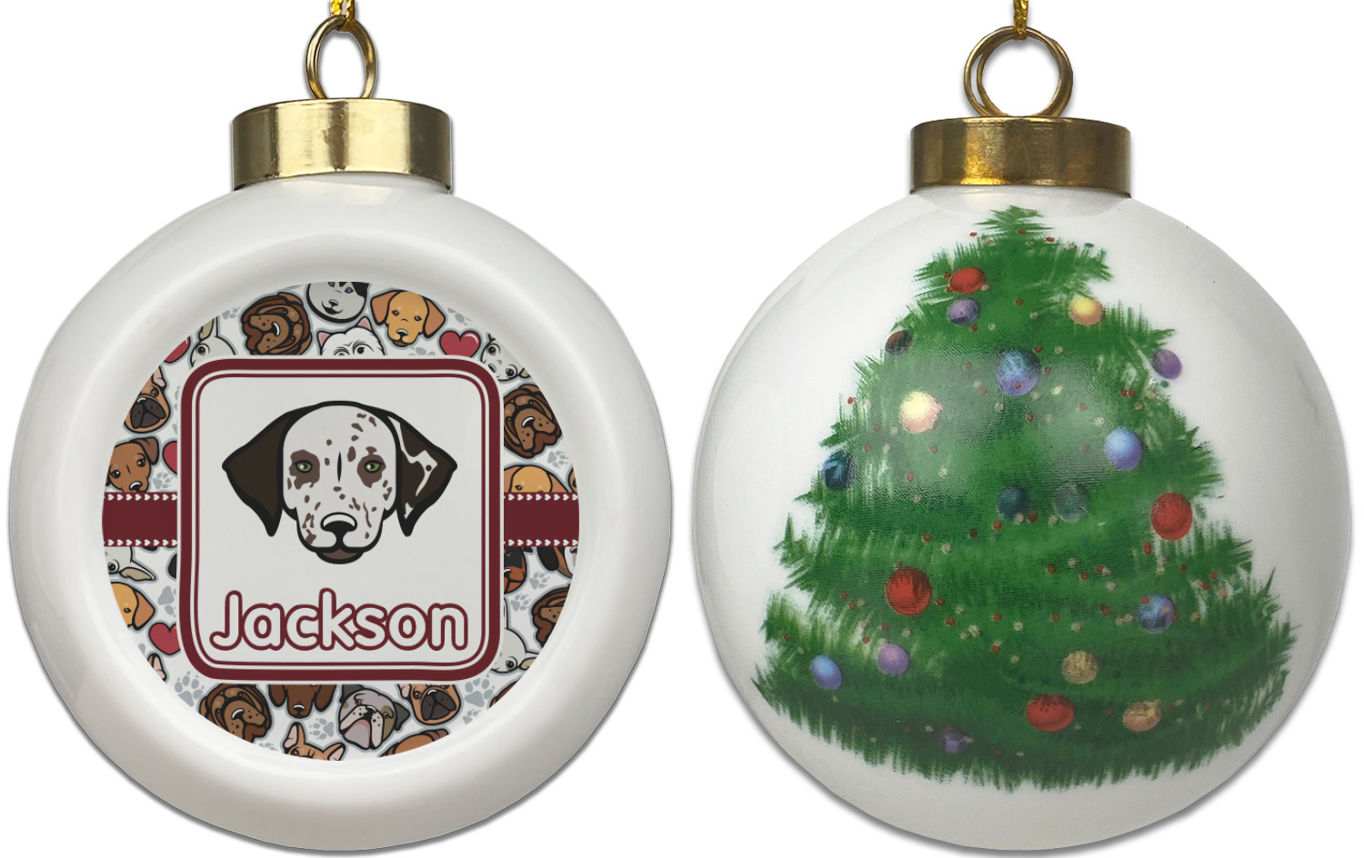 Our Christmas ornaments are a unique ceramic ball shape with a twist as it has a flat face to display your custom design! Select from one of our two design types - Christmas Tree or Poinsettia Garland - to adorn the curved back of your personal design. Each ornament measures 3H x 2.5W x 2D accompanied with a gold string accent for finishing touches to hang on your beautiful Christmas tree!