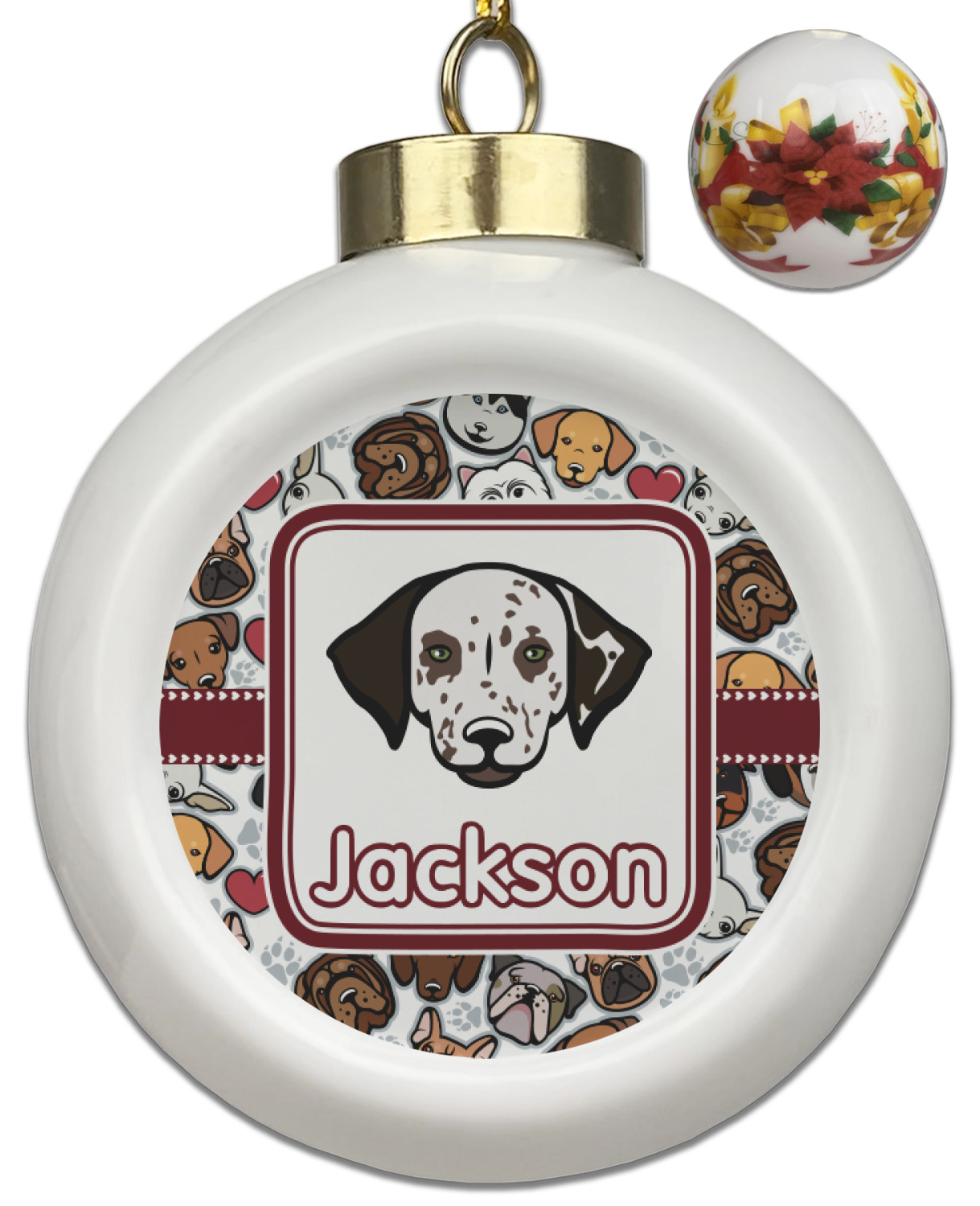 Our Christmas ornaments are a unique ceramic ball shape with a twist as it has a flat face to display your custom design! Select from one of our two design types - Christmas Tree or Poinsettia Garland - to adorn the curved back of your personal design. Each ornament measures 3H x 2.5W x 2D accompanied with a gold string accent for finishing touches to hang on your beautiful Christmas tree!