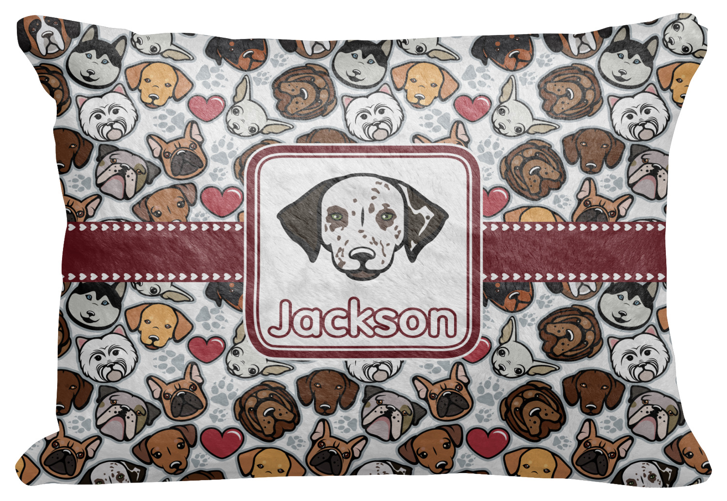 We chose a maroon ribbon with hearts and a square label. We chose the graphic and text for the label contents and featured the Dalmatian / Terrier face along with a name to personalized it.