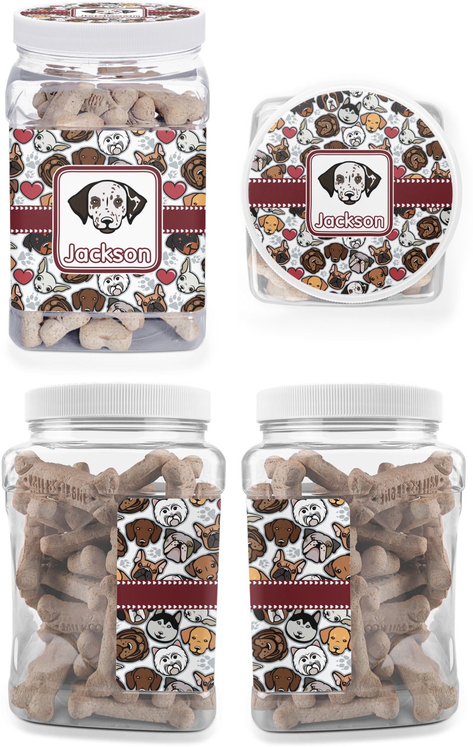 In the market for some other, cute pet supplies? Have a look at our Pet Accessories department, where you can customize a matching dog food bowl, dog food mat, or even a glass dog treat jar! Overjoyed with the idea of a customizable container? Explore the kitchen department within our Home and Garden category, where you can personalize snack containers for humans, as a gift, or just as a part of your kitchen decor!