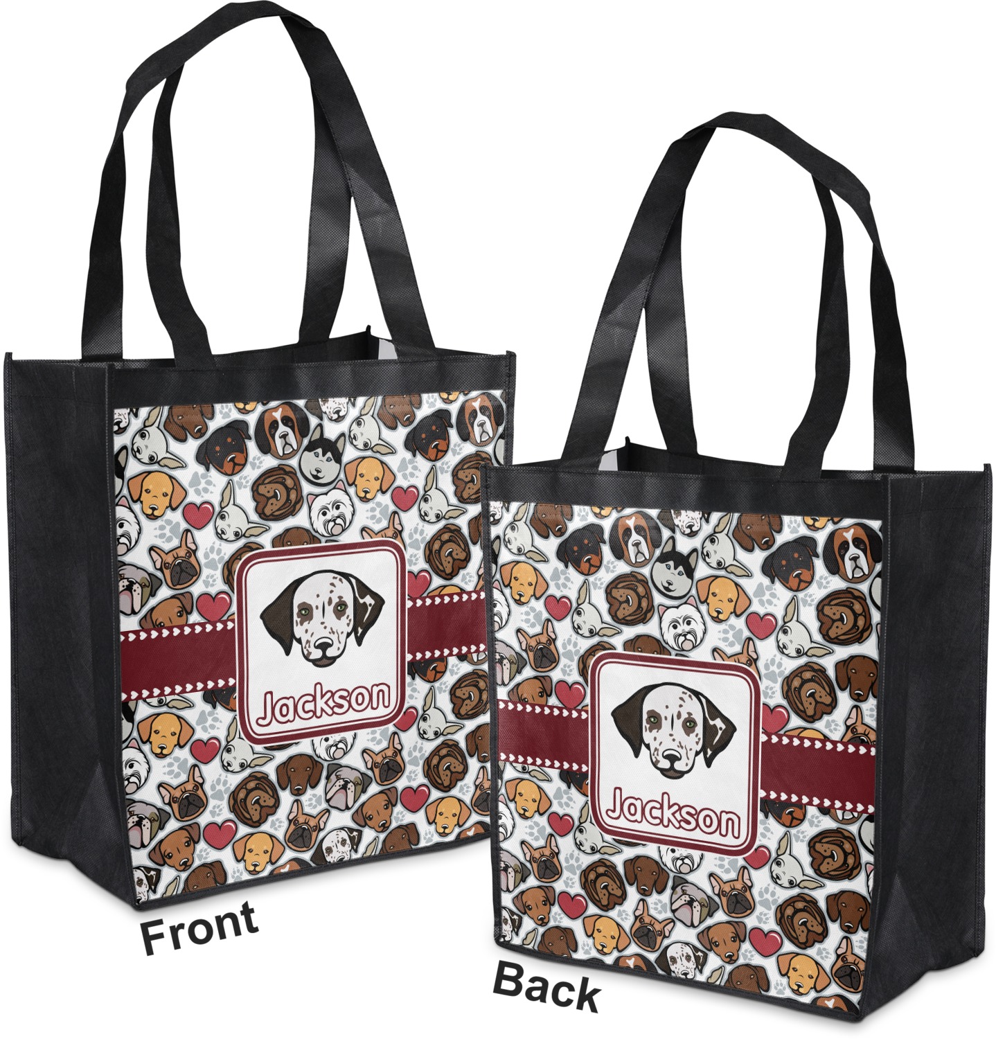 Made from a durable, biodegradable material, these reusable shopping bags can support up to 30 pounds of weight. With two large handles, measuring at 8.5 inches each, these personalized tote bags are easy to carry to your vehicle or home. The bag itself is 12 by 13.5 inches, and can expand to a depth of 7 inches. Your customization is printed on both the front and back, while the remaining sides, trim, and handle are a sleek, charcoal black.