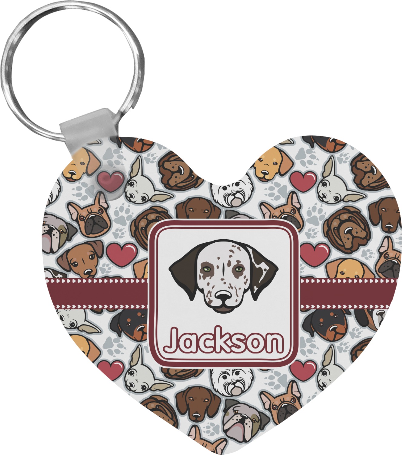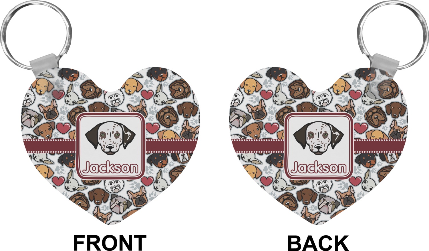 We chose a maroon ribbon with hearts and a square label. We chose the graphic and text for the label contents and featured the Dalmatian / Terrier face along with a name to personalized it.