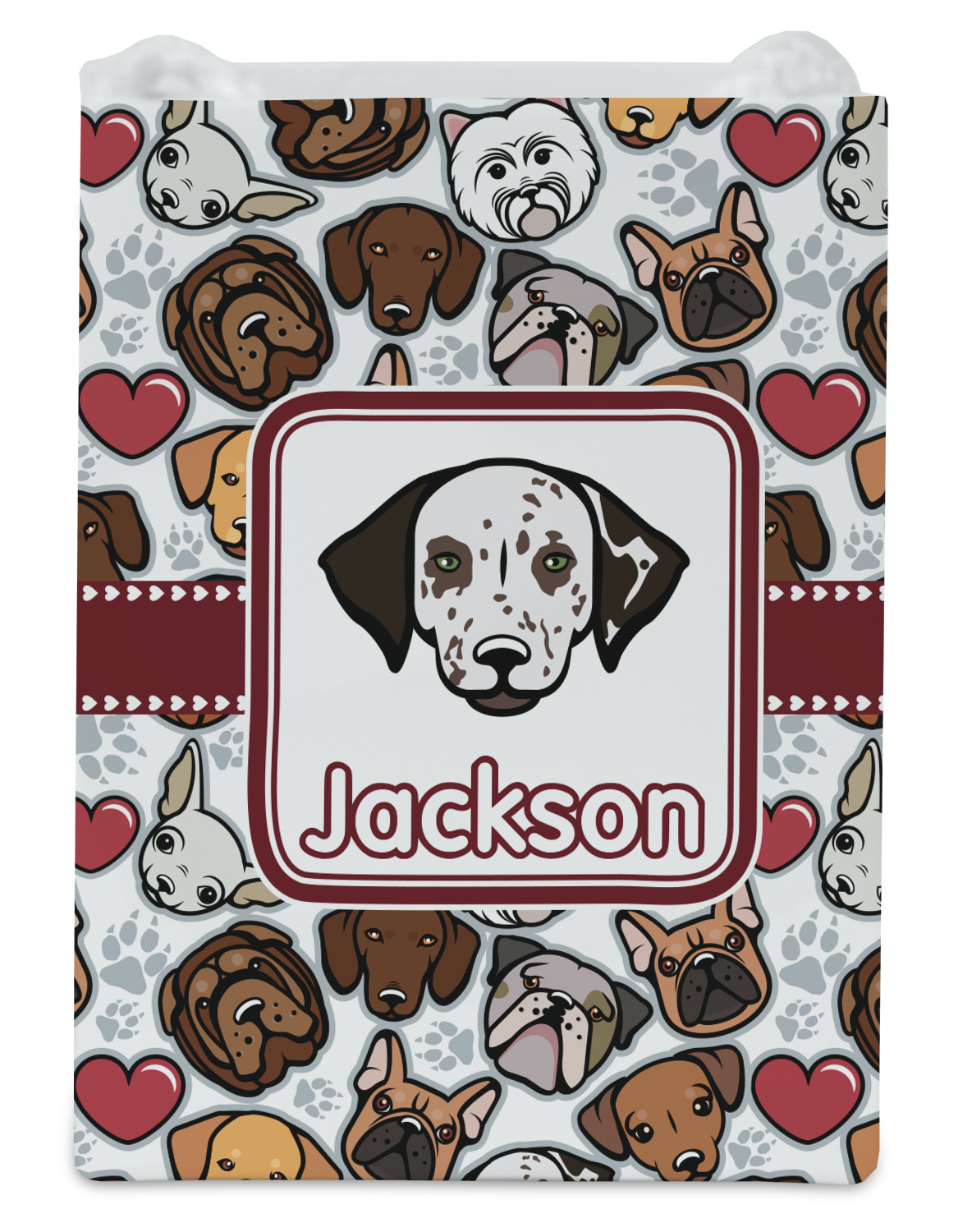 We chose a maroon ribbon with hearts and a square label. We chose the graphic and text for the label contents and featured the Dalmatian / Terrier face along with a name to personalized it.