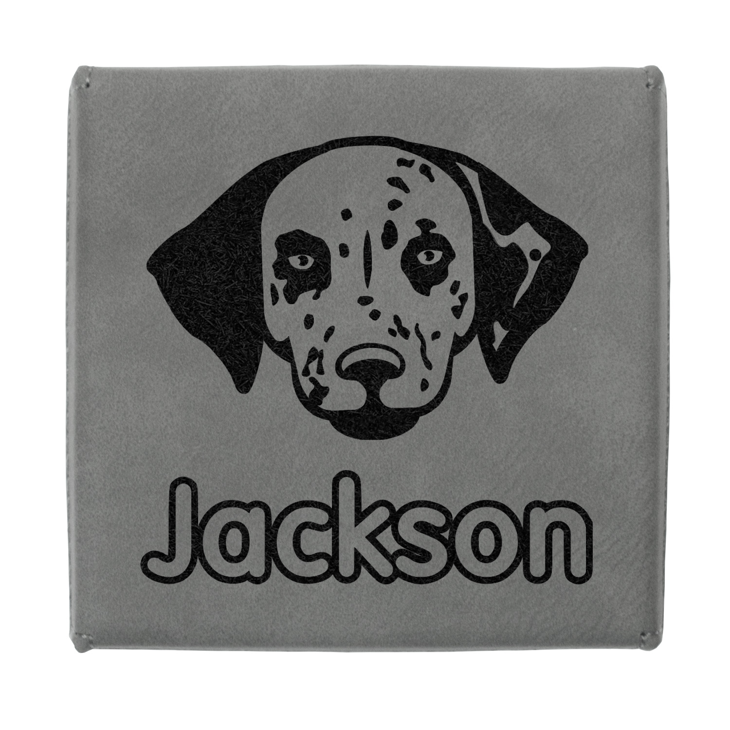 We chose a maroon ribbon with hearts and a square label. We chose the graphic and text for the label contents and featured the Dalmatian / Terrier face along with a name to personalized it.