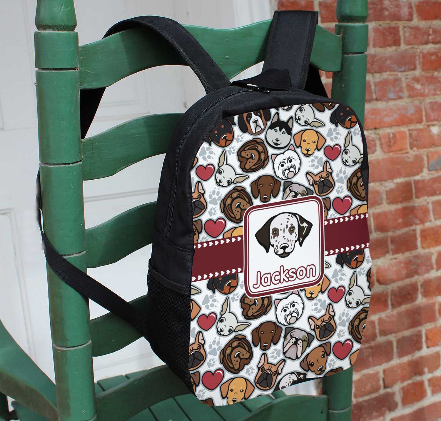 These small backpacks are made of a durable black canvas material with your personalization right on the front. The two shoulder straps are padded and easily adjustable. The bag itself measures at about 11" W x 15" H x 5" D. It's the perfect size for elementary aged kids or adults who want a smaller backpack. On the top of the bag you will find a handle to hang or carry your backpack by as well as a large zipper closure to keep all of your belongings safe inside. On each side of your backpack is a mesh pocket for a small item or water bottle. Inside your backpack you will find a spacious area with a small zipper pocket and a padded laptop slot that will fit up to a 13" laptop (13" being very snug). This is the perfect bag for any student that needs a couple books and their laptop with them at all times. It also works great as a carry on for traveling!
