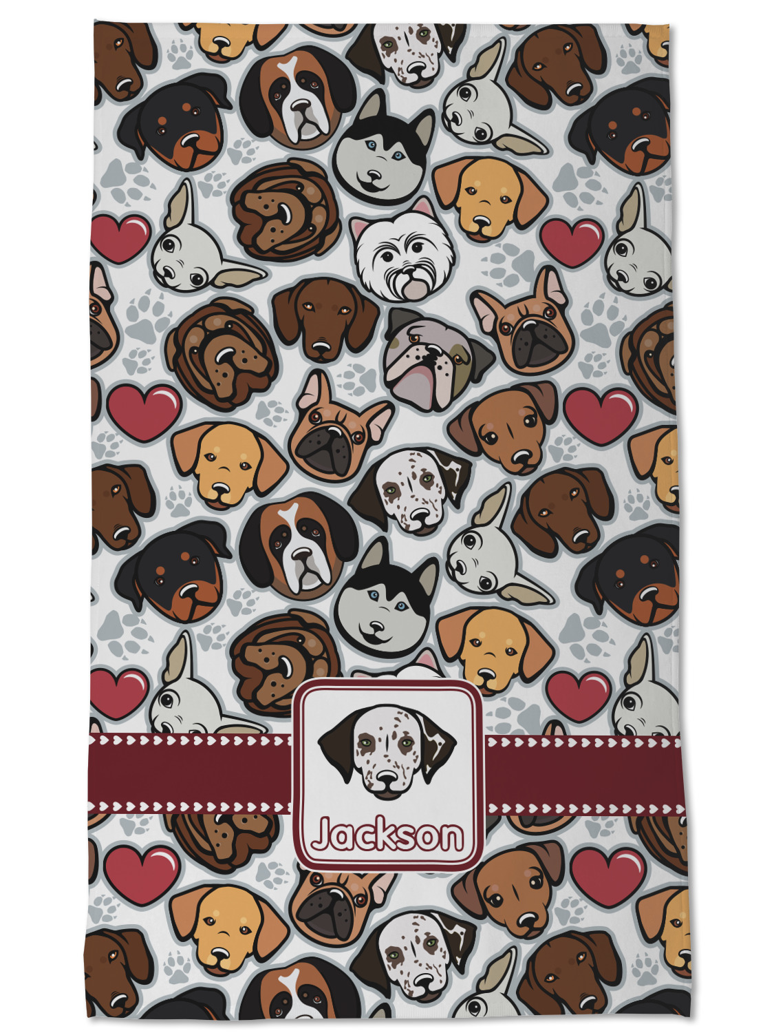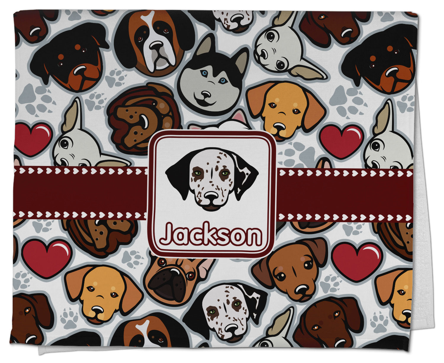 We chose a maroon ribbon with hearts and a square label. We chose the graphic and text for the label contents and featured the Dalmatian / Terrier face along with a name to personalized it.