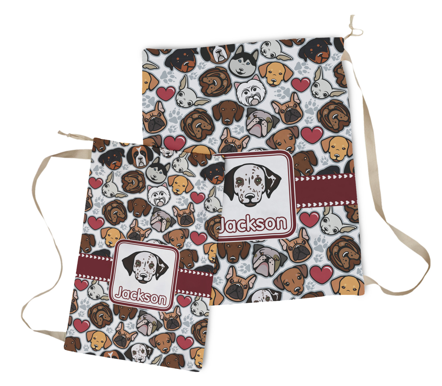 We chose a maroon ribbon with hearts and a square label. We chose the graphic and text for the label contents and featured the Dalmatian / Terrier face along with a name to personalized it.