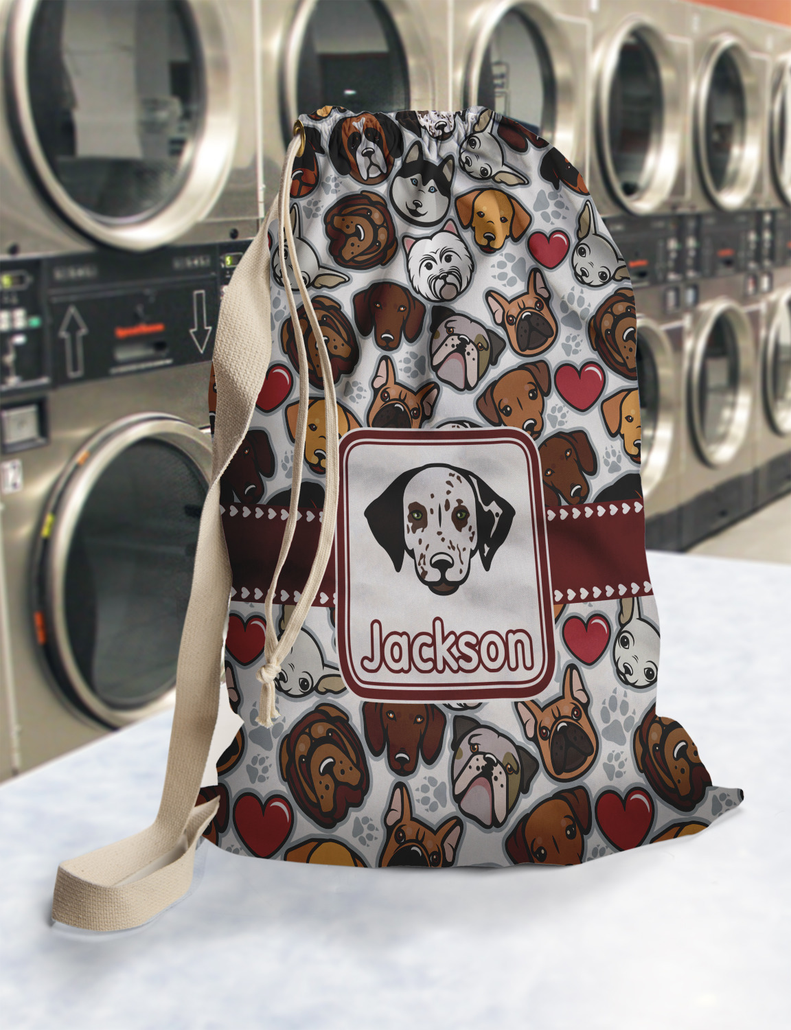 Carry your laundry in style with these customized laundry bags. Available in two sizes, featuring a natural colored woven strap and a cinch cord, these bags hold a lot of clothes or anything else you want to fit in them.
