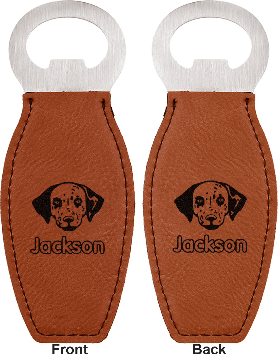 Built from stainless steel, these custom bottle openers are wrapped in a cognac-colored leatherette. Sharp, black stitching lines the edges for extra durability and a finished touch. Your personalization is laser-engraved onto the surface of this leatherette, leaving behind a crisp, black coloration. At 4.6 by 1.8 inches, this beer bottle opener gives you much of leverage when trying to open a stubborn bottle. On the opposite end of the opener, you'll find a magnet that you can use to display your new, unique bottle opener!