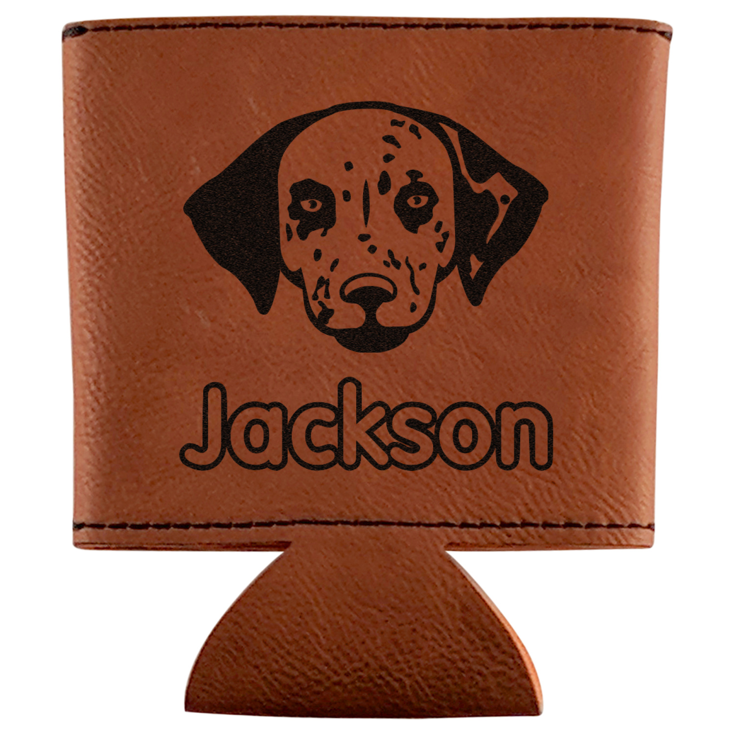This can sleeve is made from a cognac-brown leatherette and stitched with a sturdy, black thread. A slim padding lines the inside of your can sleeve to allow for a better fit once your drink is inserted. The sleeve itself measures at 4 by 4.5 inches, allowing this custom can sleeve to accommodate most canned drinks. Your personalized design can be engraved on the front and back, or solely the front. When laser-engraved, your design appears as a black coloration which contrasts the leatherette nicely.