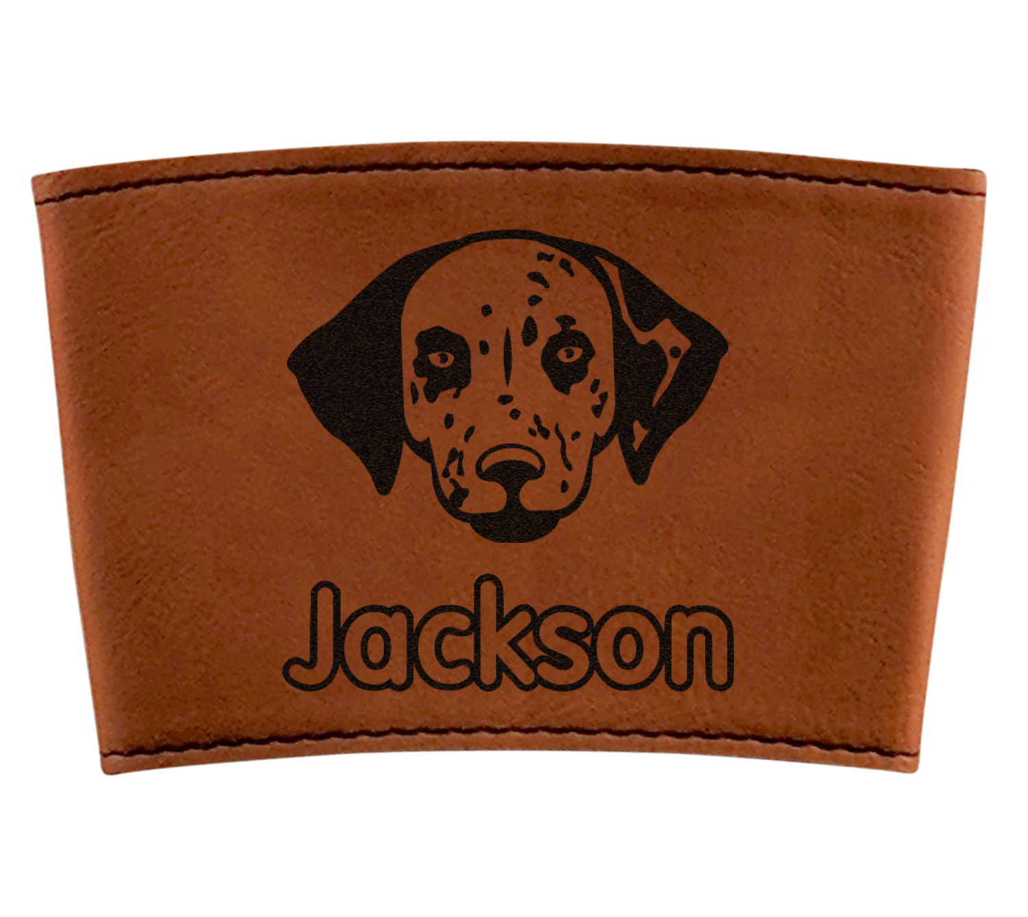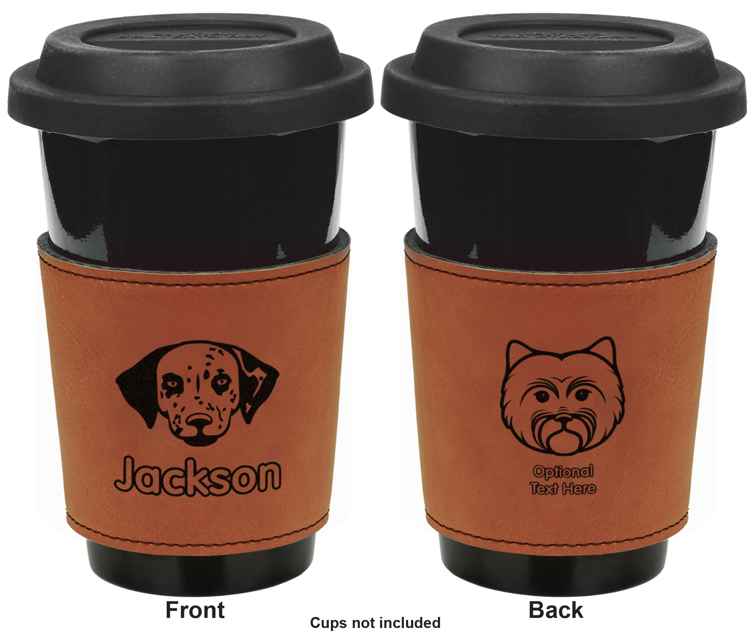 This cup sleeve is made from a suave, cognac-brown leatherette and finished with an intricate, black stitch. The interior of this can sleeve is fabricated from a thin foam material to help insulate your mug's contents. The sleeve is specifically made to suit tapered glasses or mugs, so the top's diameter is 3.5 inches, while the bottom's diameter is 2.75 inches. Your customized design will be laser engraved into the leatherette, leaving behind crisp, black imprint. With these products, we provide you with the option of engraving the front and back, or the front only.