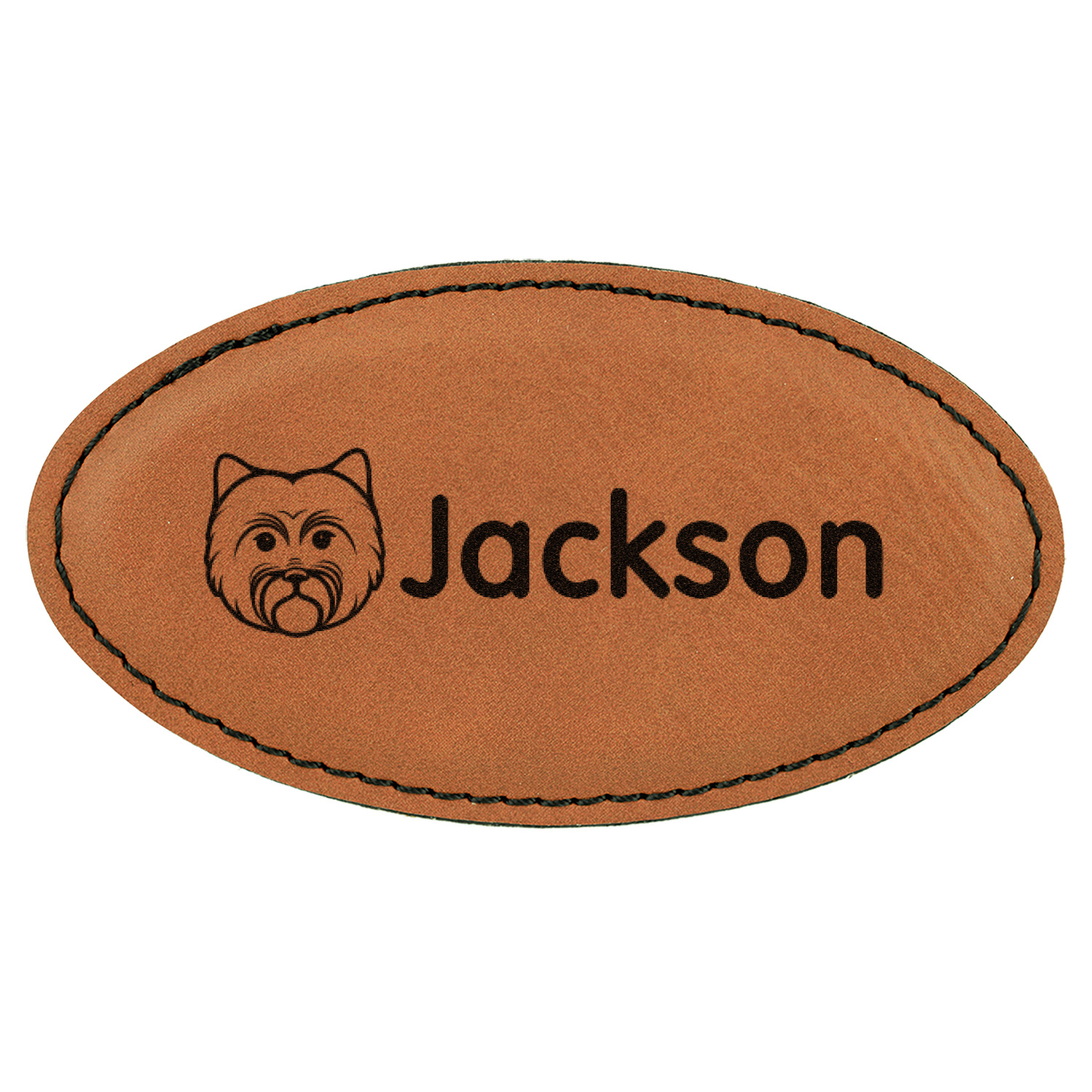 Made from a cognac-brown leatherette into an oval shape, these custom name badges measure at around 3.25" x 1.75". To add the suave appearance of this custom badge, a fine black stitching lines the edges or the badge itself. Your customized design is laser-engraved onto the surface of the leatherette. Accompanying your purchase is a removable magnet strip that can be used to secure the engraved name tag to any shirt, dress, or jacket.