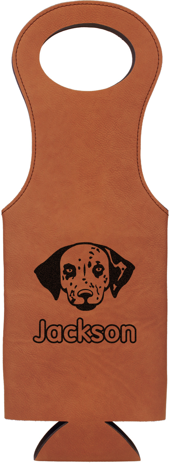 This wine carrier is made from a stunning leatherette, in a cognac-brown color. Strong, black stitching lines the sides of your wine bottle bag and provides extra durability. The interior is lined with a padded, black material to allow for a snug fit once your bottle is placed inside. At the top of this wine gift bag, you'll find two oval shaped handles that elegantly complements the rest of the bag's style. We provide you with the option of laser-engraving the front, or the front and back of your new personalized wine bag!