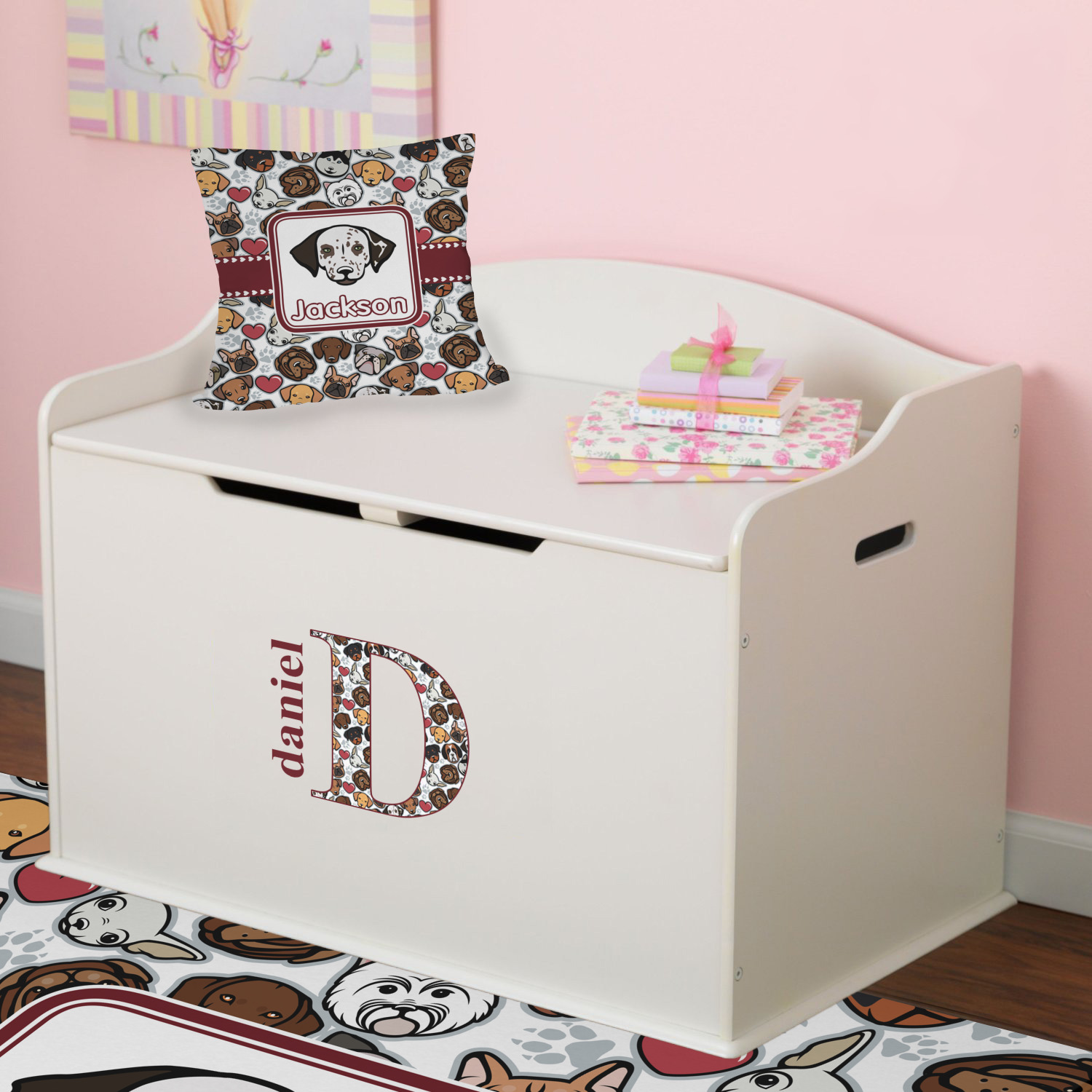 We chose a maroon ribbon with hearts and a square label. We chose the graphic and text for the label contents and featured the Dalmatian / Terrier face along with a name to personalized it.
