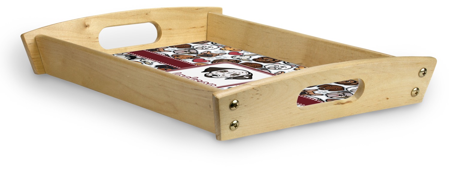 This serving tray with handles features square edges and two rounded sides, creating a very modern look. Each side is fabricated from a beautifully cut, natural wood. The bottom of the interior of the tray displays your customized design in bright, vibrant color. The tray is sold in both a black color and a natural wood look. Each variation of the wood serving tray has two sizes: Small, which is 14" x 10" x 2.25", and Large, which is 19.5" x 13.5" x 2.75".