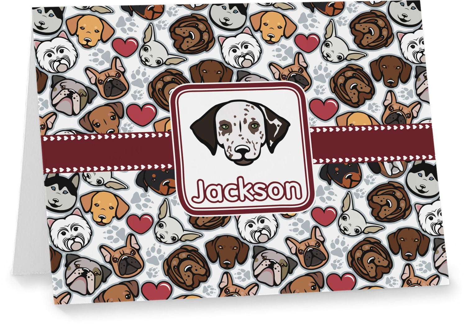 We chose a maroon ribbon with hearts and a square label. We chose the graphic and text for the label contents and featured the Dalmatian / Terrier face along with a name to personalized it.