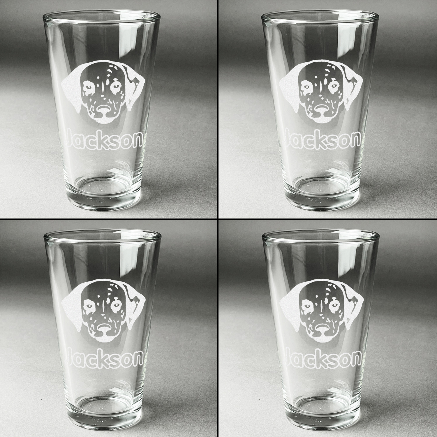 Available in a single glass or a set of 4 - each glass will be custom engraved with your design. Each glass holds 16 oz and measure 5.75"H x 3.5"W.