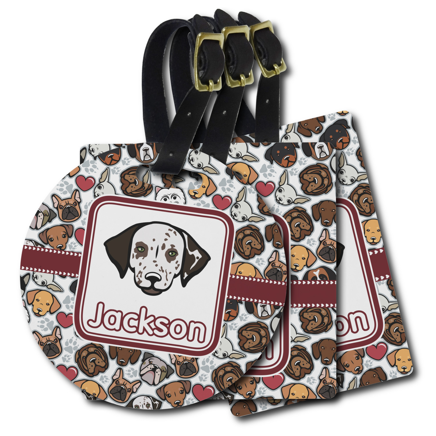 We chose a maroon ribbon with hearts and a square label. We chose the graphic and text for the label contents and featured the Dalmatian / Terrier face along with a name to personalized it.