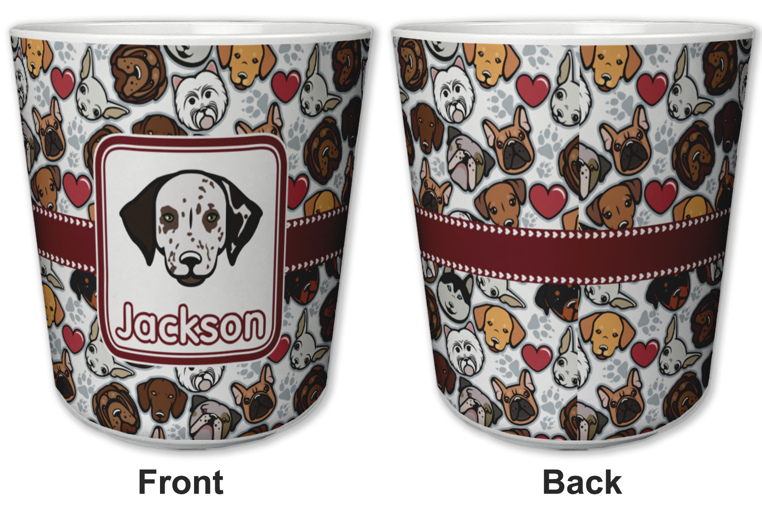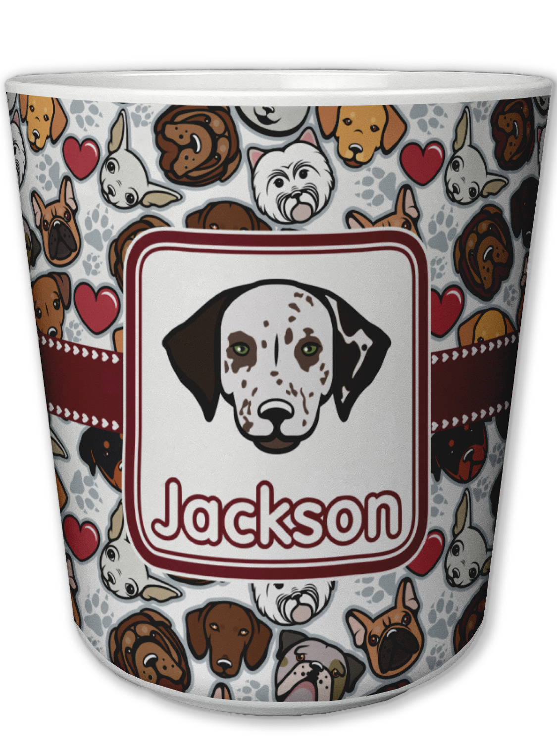 We chose a maroon ribbon with hearts and a square label. We chose the graphic and text for the label contents and featured the Dalmatian / Terrier face along with a name to personalized it.