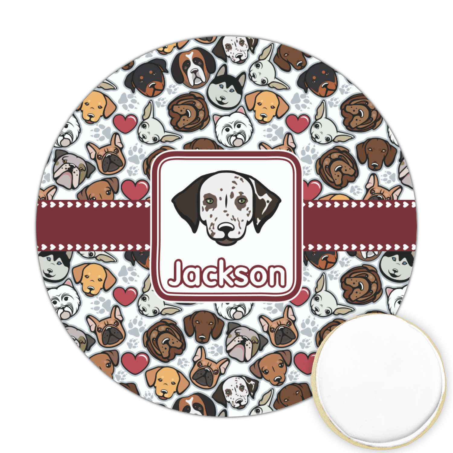 We chose a maroon ribbon with hearts and a square label. We chose the graphic and text for the label contents and featured the Dalmatian / Terrier face along with a name to personalized it.