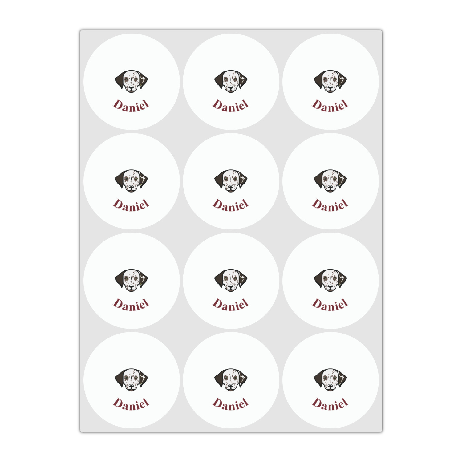 We chose a maroon ribbon with hearts and a square label. We chose the graphic and text for the label contents and featured the Dalmatian / Terrier face along with a name to personalized it.