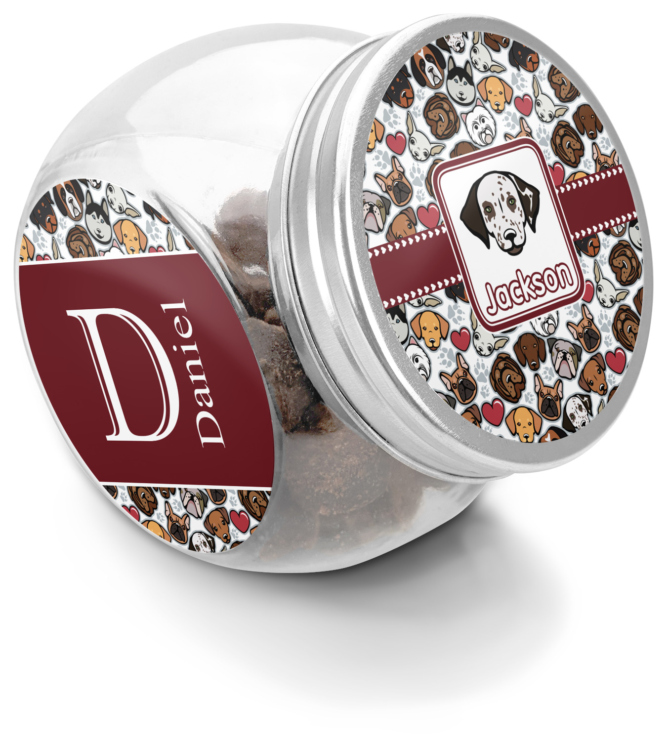 Pleased with your customized design? Perhaps purchase a matching dog food bowl, dog food mat, or even another, larger dog treat jar! Check out our Pet Accessories Department for even more gift options for your puppy.