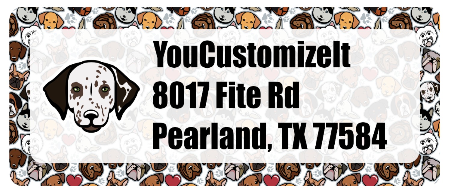 We chose a maroon ribbon with hearts and a square label. We chose the graphic and text for the label contents and featured the Dalmatian / Terrier face along with a name to personalized it.