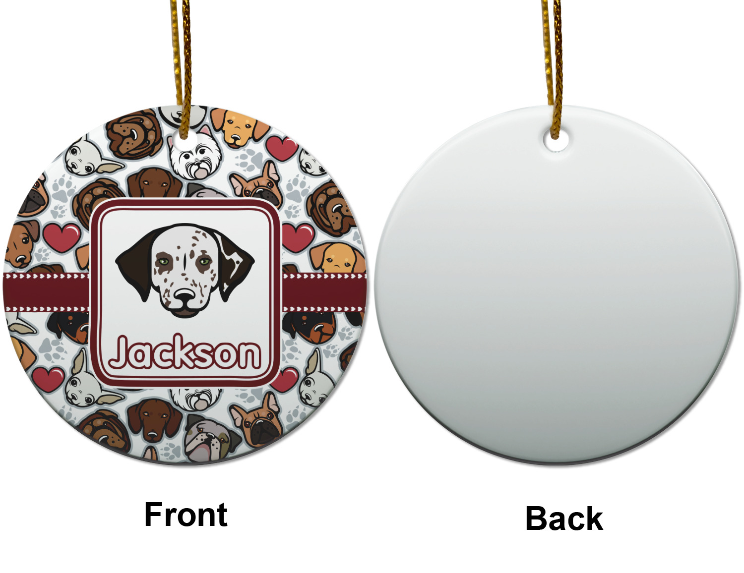 We chose a maroon ribbon with hearts and a square label. We chose the graphic and text for the label contents and featured the Dalmatian / Terrier face along with a name to personalized it.