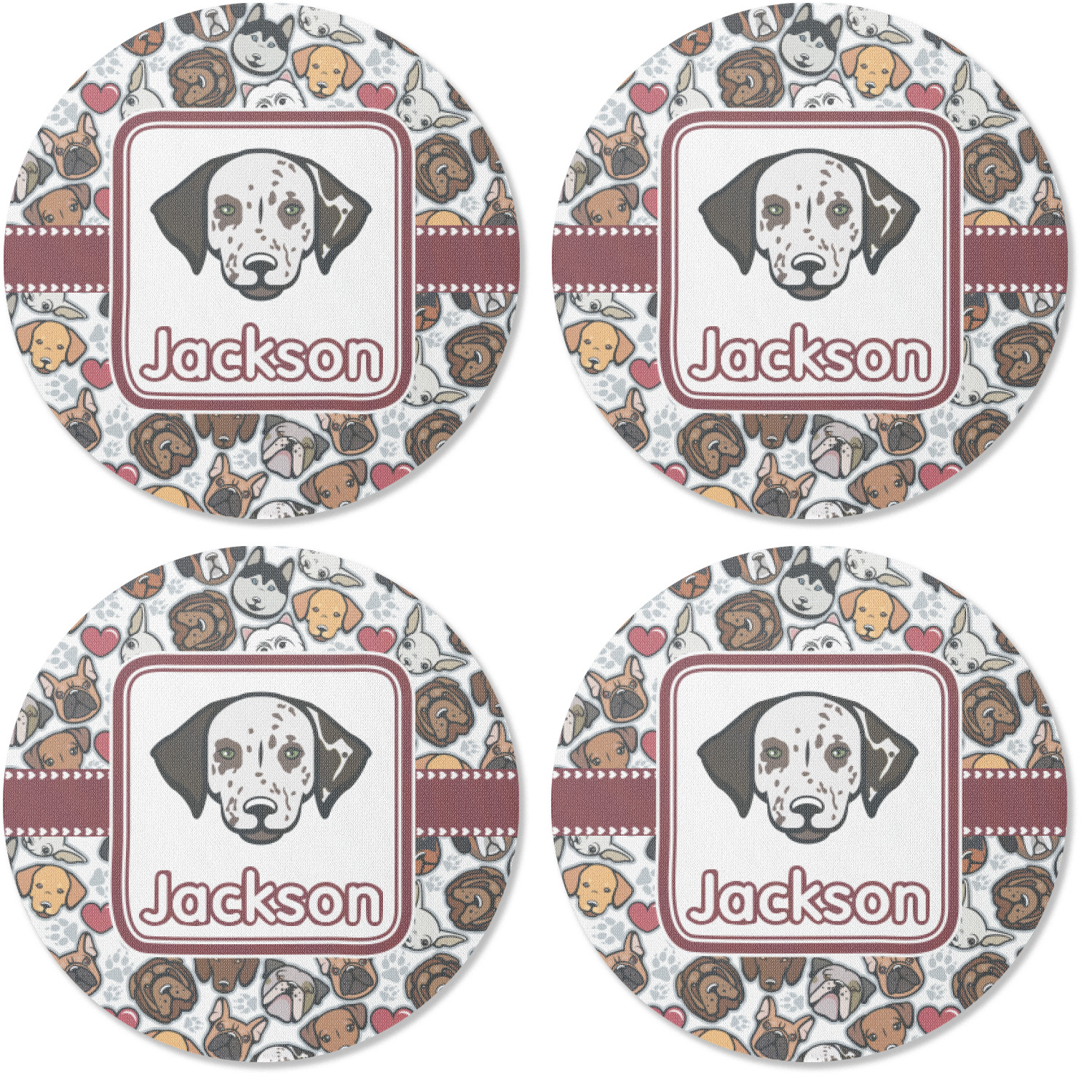 We chose a maroon ribbon with hearts and a square label. We chose the graphic and text for the label contents and featured the Dalmatian / Terrier face along with a name to personalized it.