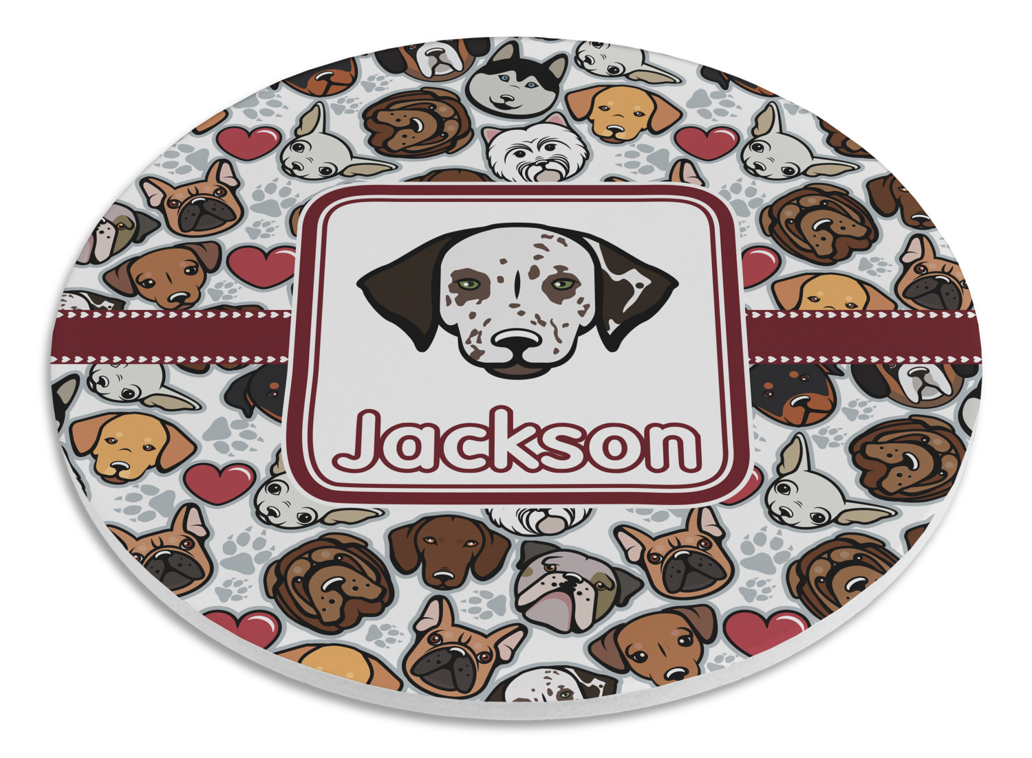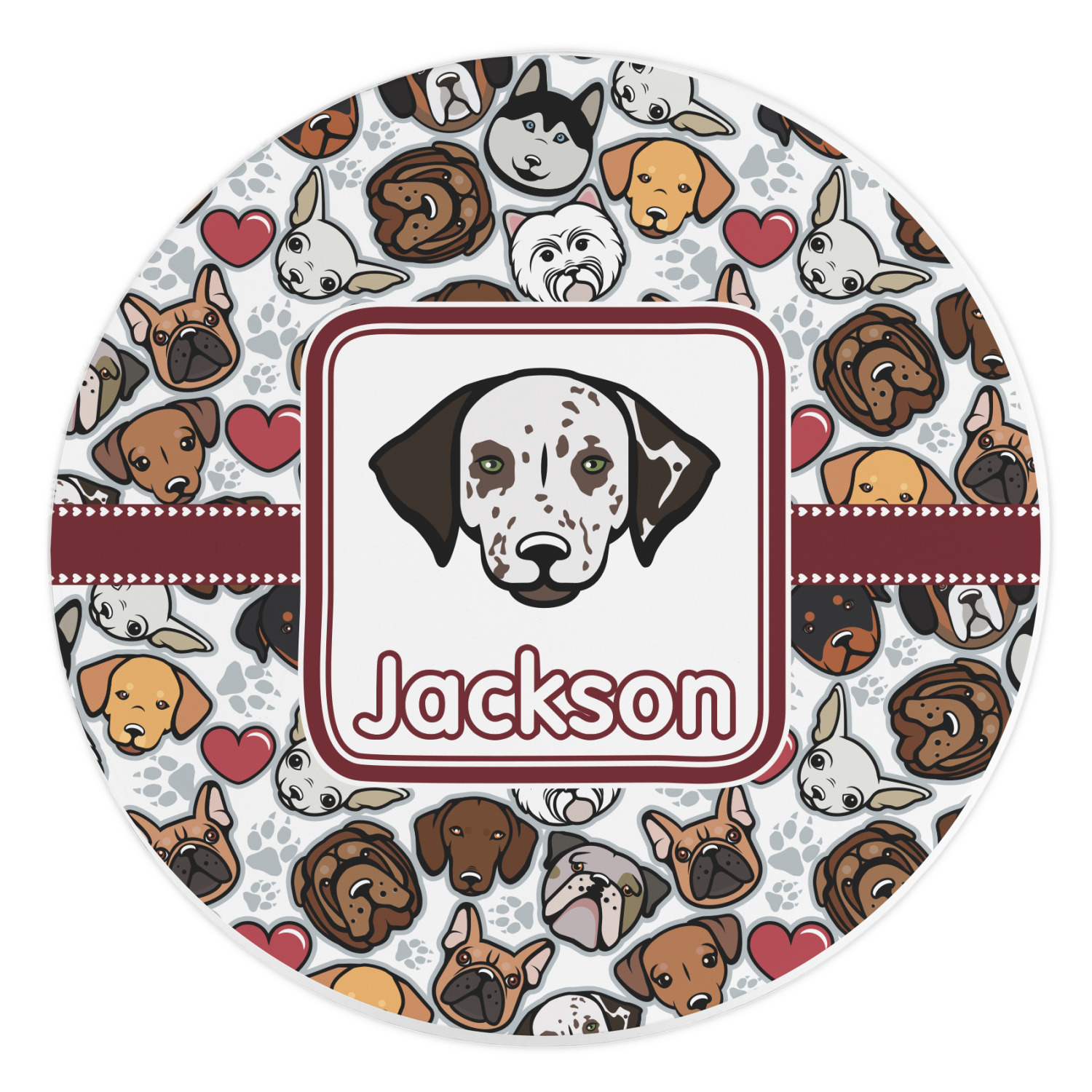We chose a maroon ribbon with hearts and a square label. We chose the graphic and text for the label contents and featured the Dalmatian / Terrier face along with a name to personalized it.