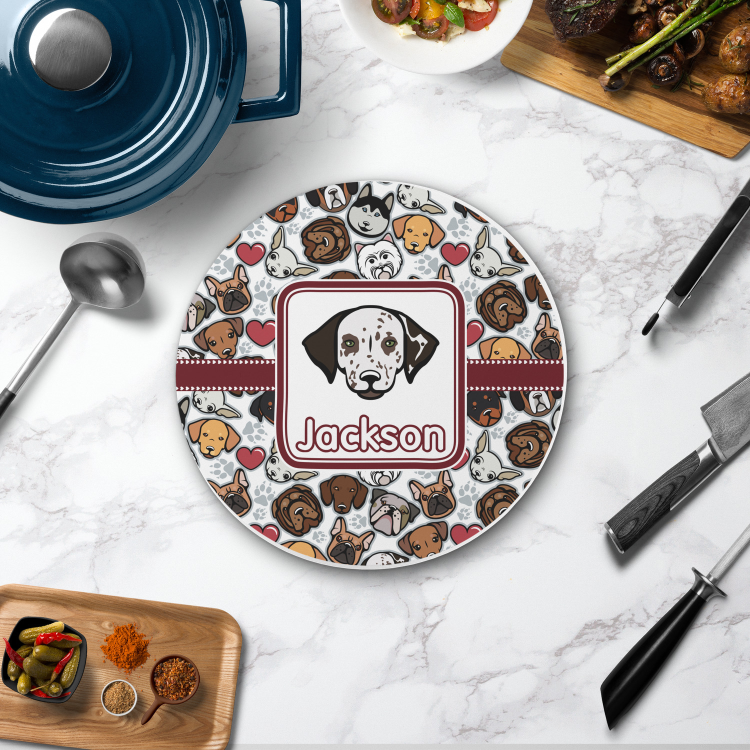 The round trivets can be customized with your own design, your own photo, or your own logo. You can add personalization, like a monogram, family name or initial to your uploaded design / art. You can also customize one of our designs and change the patterns, colors, personalization, fonts etc.