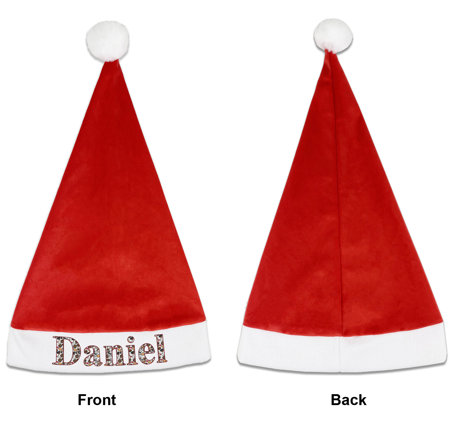 Our Santa hats are a soft, velvety polyester material. These customizable Santa hats are a classic red with white brimming and pom pom ball hanging off the hat tail just like Santa Claus! Each personalized Santa hat is approximately 17.5 L x 11.8 W. We offer two different styles to print your designs on the white brim - front or front & back.