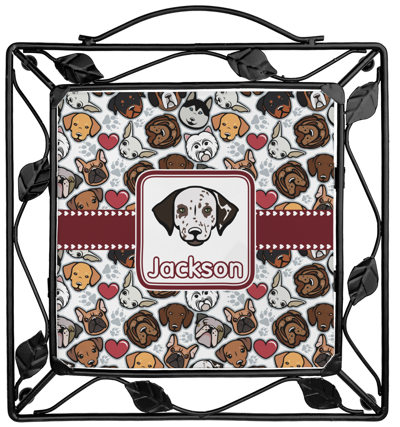 Our square trivets are made from a durable, wrought iron. This model features 4 small half circles, one on each corner, and a larger ring of iron that circles the central, customized tile. Each of the 4 corners has a round foot on its bottom for stability. This trivet is 8.75 by 8.75 inches, but the central tile measures at 6 inches on both sides.