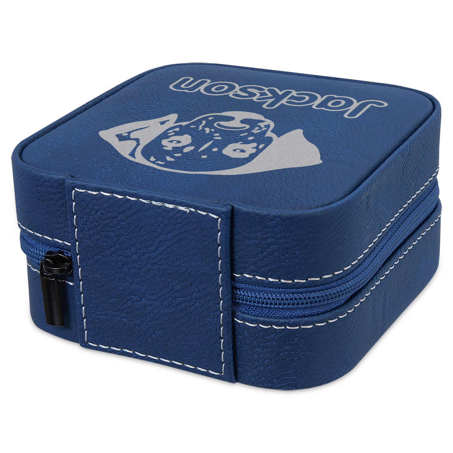 This square zippered travel jewelry box is made from leatherette and is available in four colors - classic cognac / rawhide, a beautiful teal. navy blue or pink. The tan colored soft velvet inside has compartments and hooks for all your jewelry - rings, chains, earrings, bangles etc.