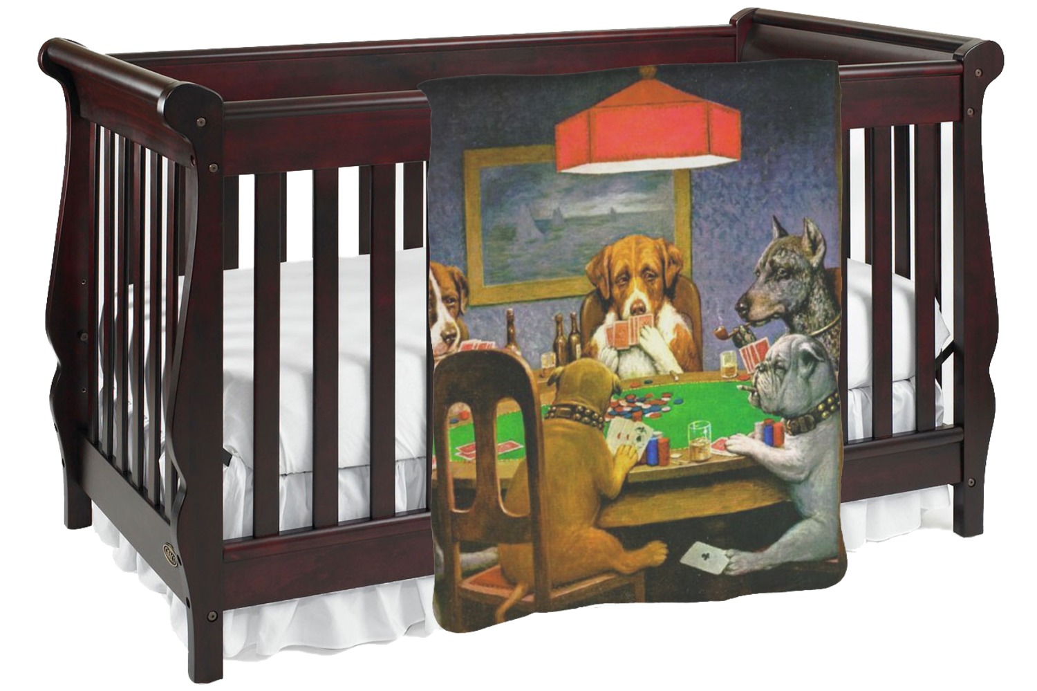 Dogs Playing Poker refers collectively to an 1894 painting, a series of sixteen oil paintings, and a 1910 painting by Cassius Marcellus Coolidge. Brown & Bigelow commissioned the 16 painting series in 1903 to advertise cigars. All eighteen paintings in the series feature personified dogs, but the eleven in which dogs are seated around a card table have become well known in the United States as examples of Kitsch art in home decoration. Source: Wikipedia