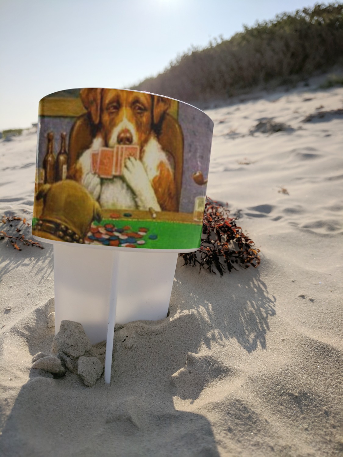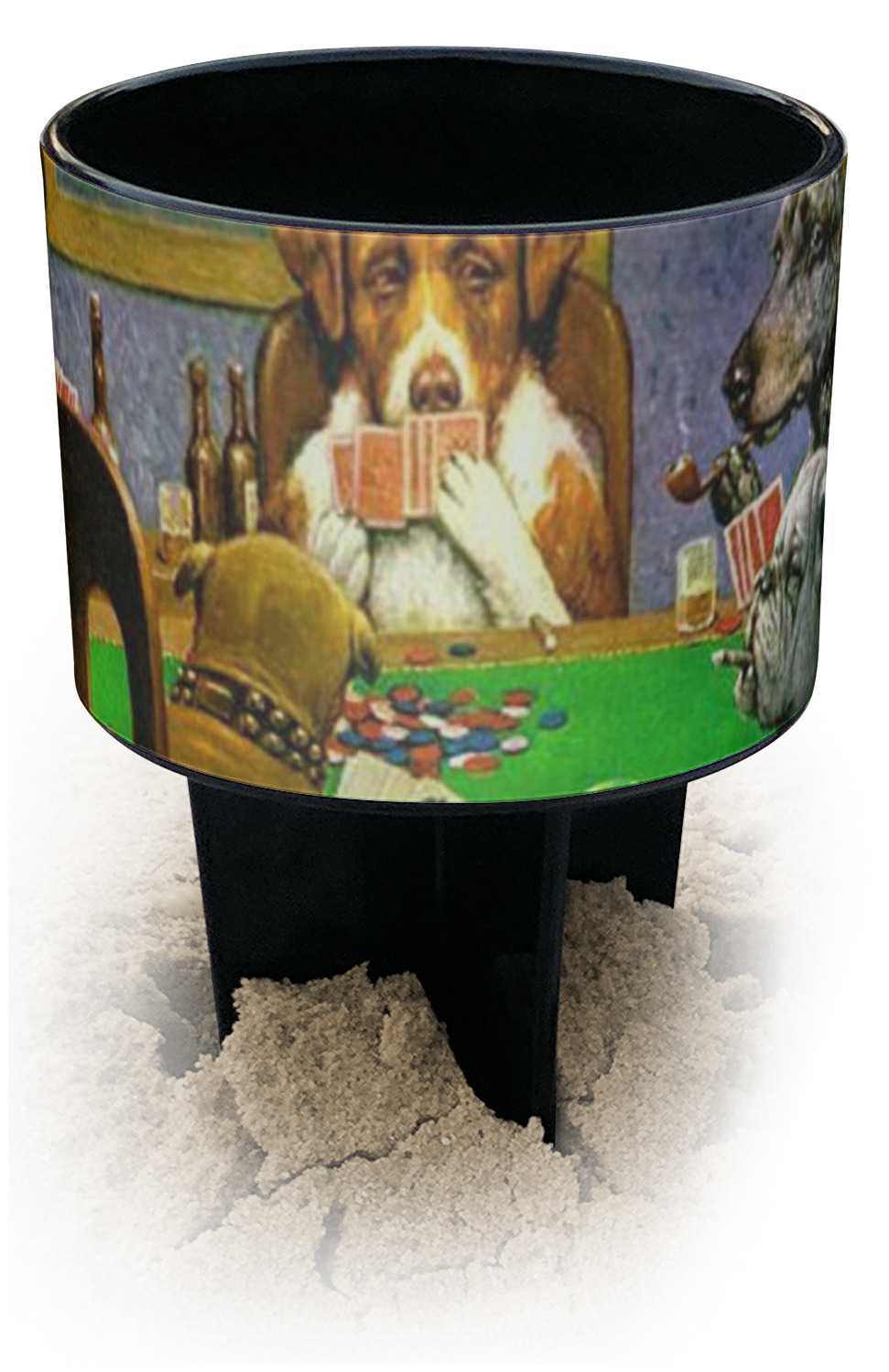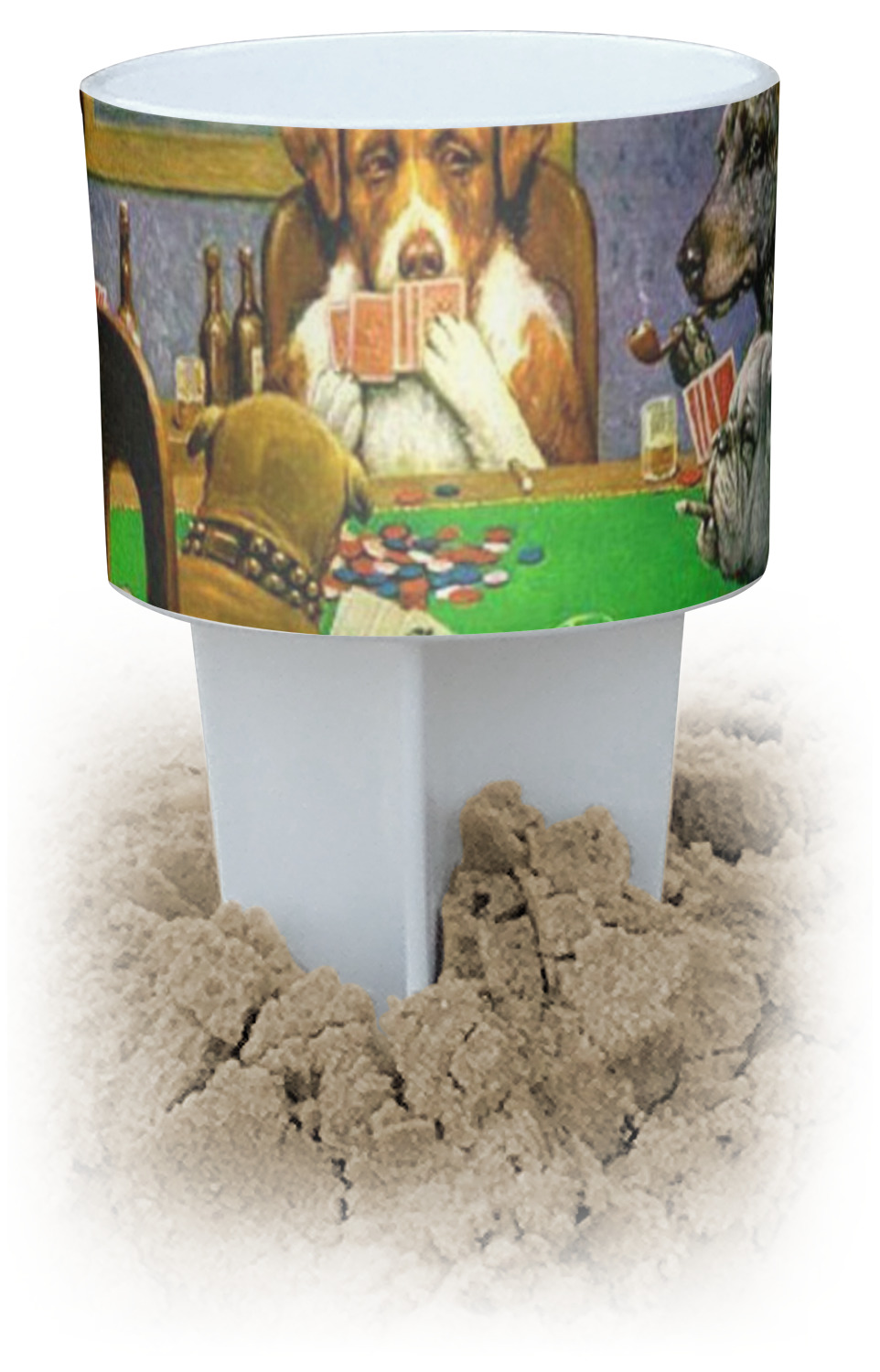 This cup holder has a large stake at its bottom that anchors it to the sand or ground below, while the cup holder rests above the stake. The entire drink holder is made of durable plastic and displays your customization around the cup holder portion. We sell these personalized beach spikers in two different colors: black and white.