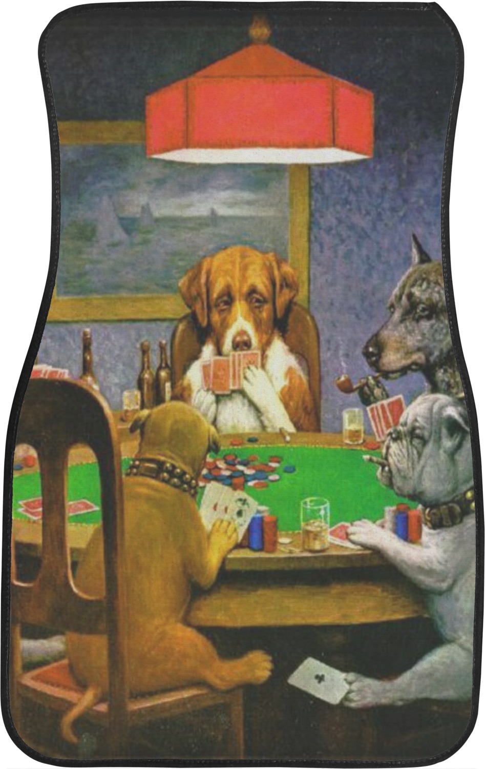 Dogs Playing Poker refers collectively to an 1894 painting, a series of sixteen oil paintings, and a 1910 painting by Cassius Marcellus Coolidge. Brown & Bigelow commissioned the 16 painting series in 1903 to advertise cigars. All eighteen paintings in the series feature personified dogs, but the eleven in which dogs are seated around a card table have become well known in the United States as examples of Kitsch art in home decoration. Source: Wikipedia