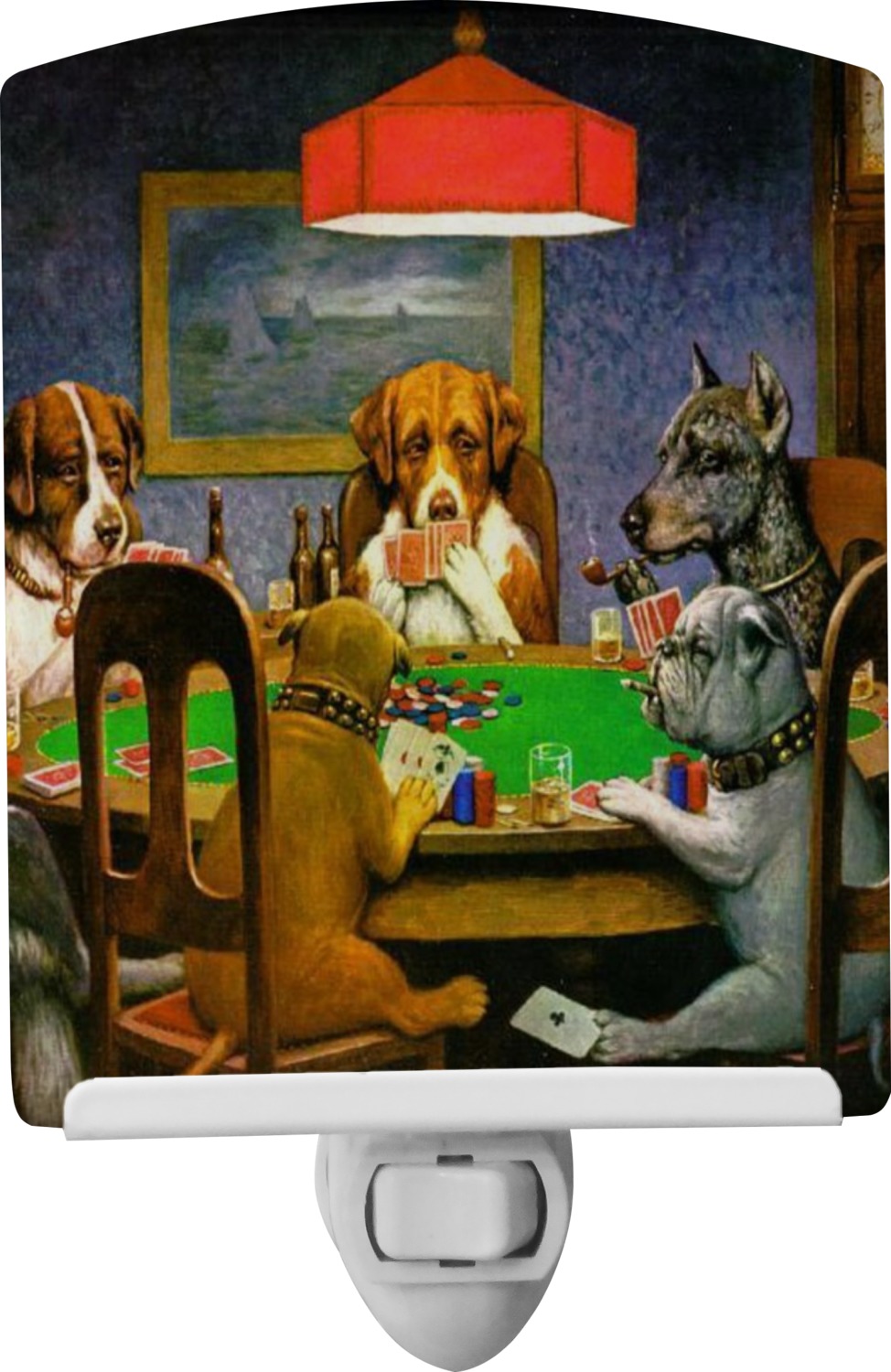 Dogs Playing Poker refers collectively to an 1894 painting, a series of sixteen oil paintings, and a 1910 painting by Cassius Marcellus Coolidge. Brown & Bigelow commissioned the 16 painting series in 1903 to advertise cigars. All eighteen paintings in the series feature personified dogs, but the eleven in which dogs are seated around a card table have become well known in the United States as examples of Kitsch art in home decoration. Source: Wikipedia