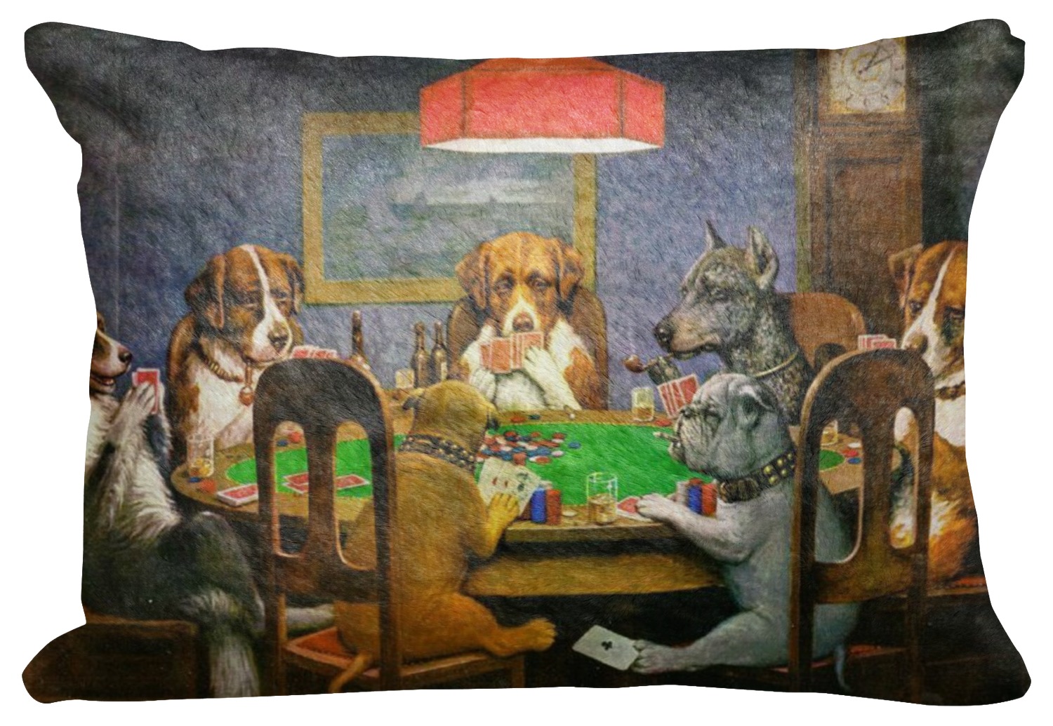 Dogs Playing Poker refers collectively to an 1894 painting, a series of sixteen oil paintings, and a 1910 painting by Cassius Marcellus Coolidge. Brown & Bigelow commissioned the 16 painting series in 1903 to advertise cigars. All eighteen paintings in the series feature personified dogs, but the eleven in which dogs are seated around a card table have become well known in the United States as examples of Kitsch art in home decoration. Source: Wikipedia