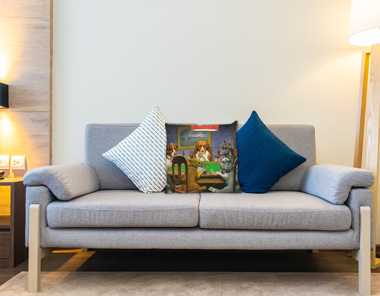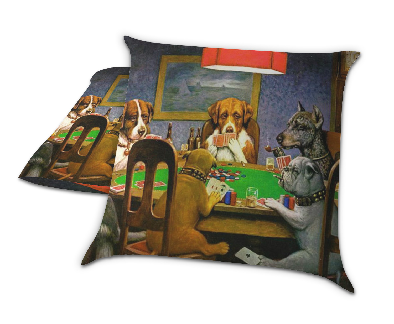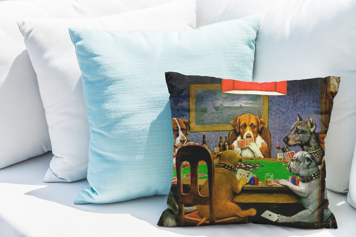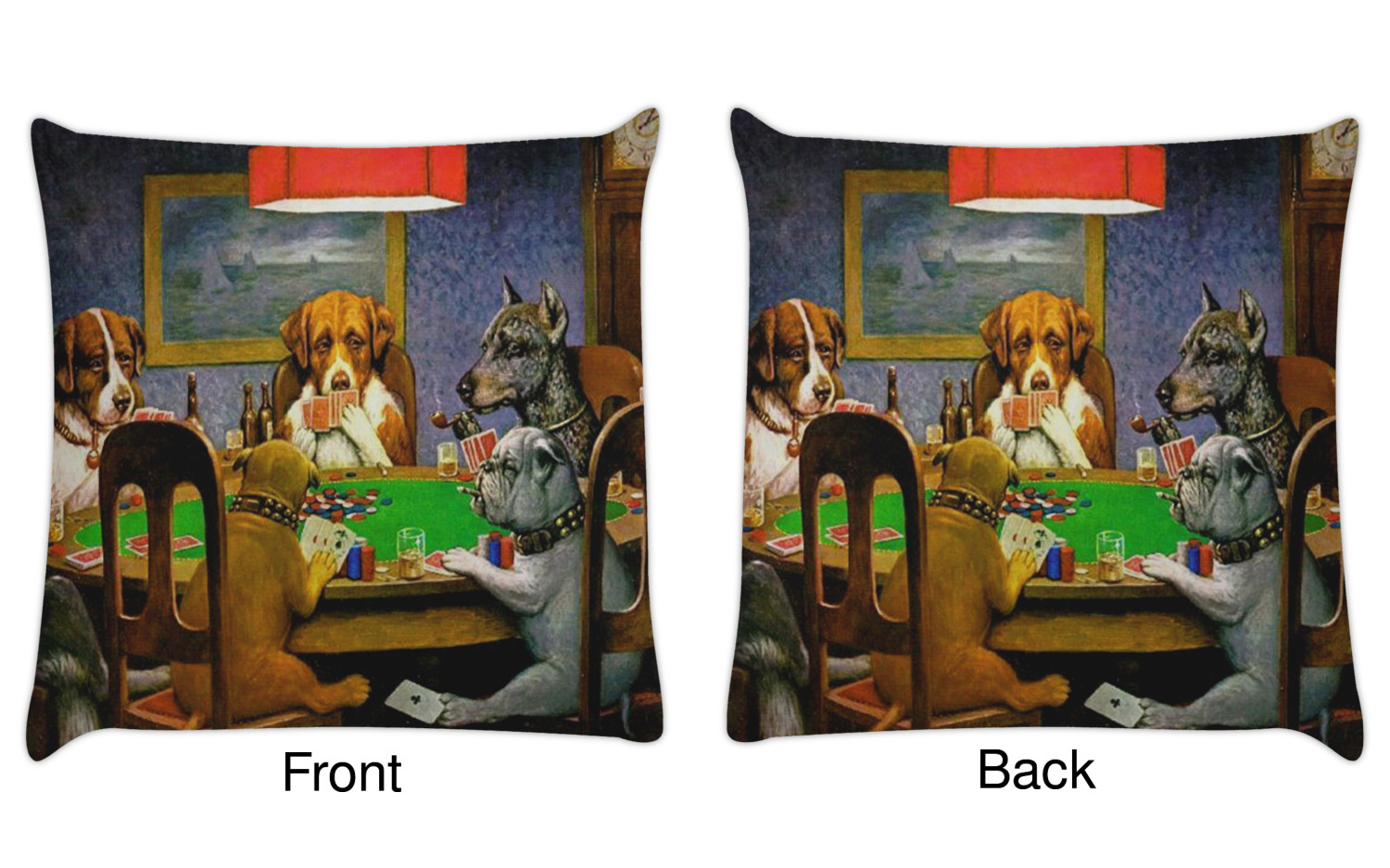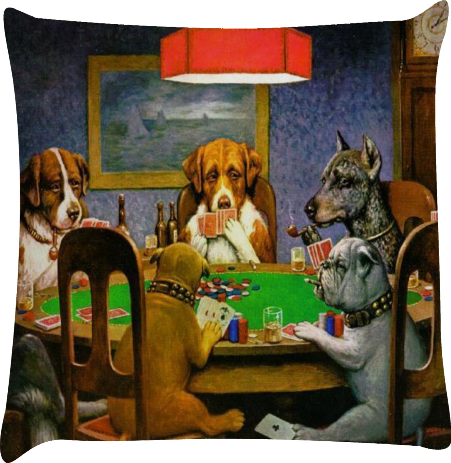 Dogs Playing Poker refers collectively to an 1894 painting, a series of sixteen oil paintings, and a 1910 painting by Cassius Marcellus Coolidge. Brown & Bigelow commissioned the 16 painting series in 1903 to advertise cigars. All eighteen paintings in the series feature personified dogs, but the eleven in which dogs are seated around a card table have become well known in the United States as examples of Kitsch art in home decoration. Source: Wikipedia