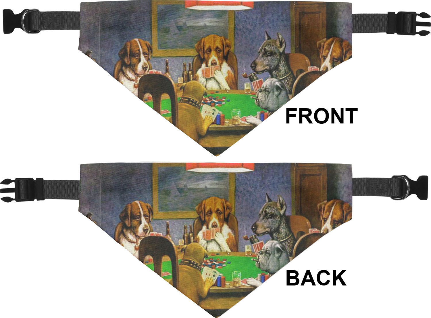 We print the front and back of these dog bandanas with your customized design. The bandana itself is made from a durable polyester, sewn together with a gap large enough to accommodate any collar. Regardless, the bandana includes a plain black, canvas collar with plastic snaps, that can easily be removed if desired. These dog bandana collars are available in four sizes: small, medium, large, and extra large. Please see our sizing chart for more information regarding the dimensions of each size.