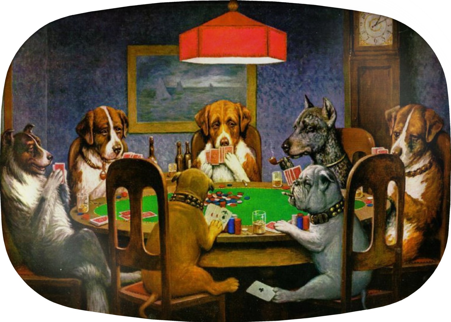 Dogs Playing Poker refers collectively to an 1894 painting, a series of sixteen oil paintings, and a 1910 painting by Cassius Marcellus Coolidge. Brown & Bigelow commissioned the 16 painting series in 1903 to advertise cigars. All eighteen paintings in the series feature personified dogs, but the eleven in which dogs are seated around a card table have become well known in the United States as examples of Kitsch art in home decoration. Source: Wikipedia