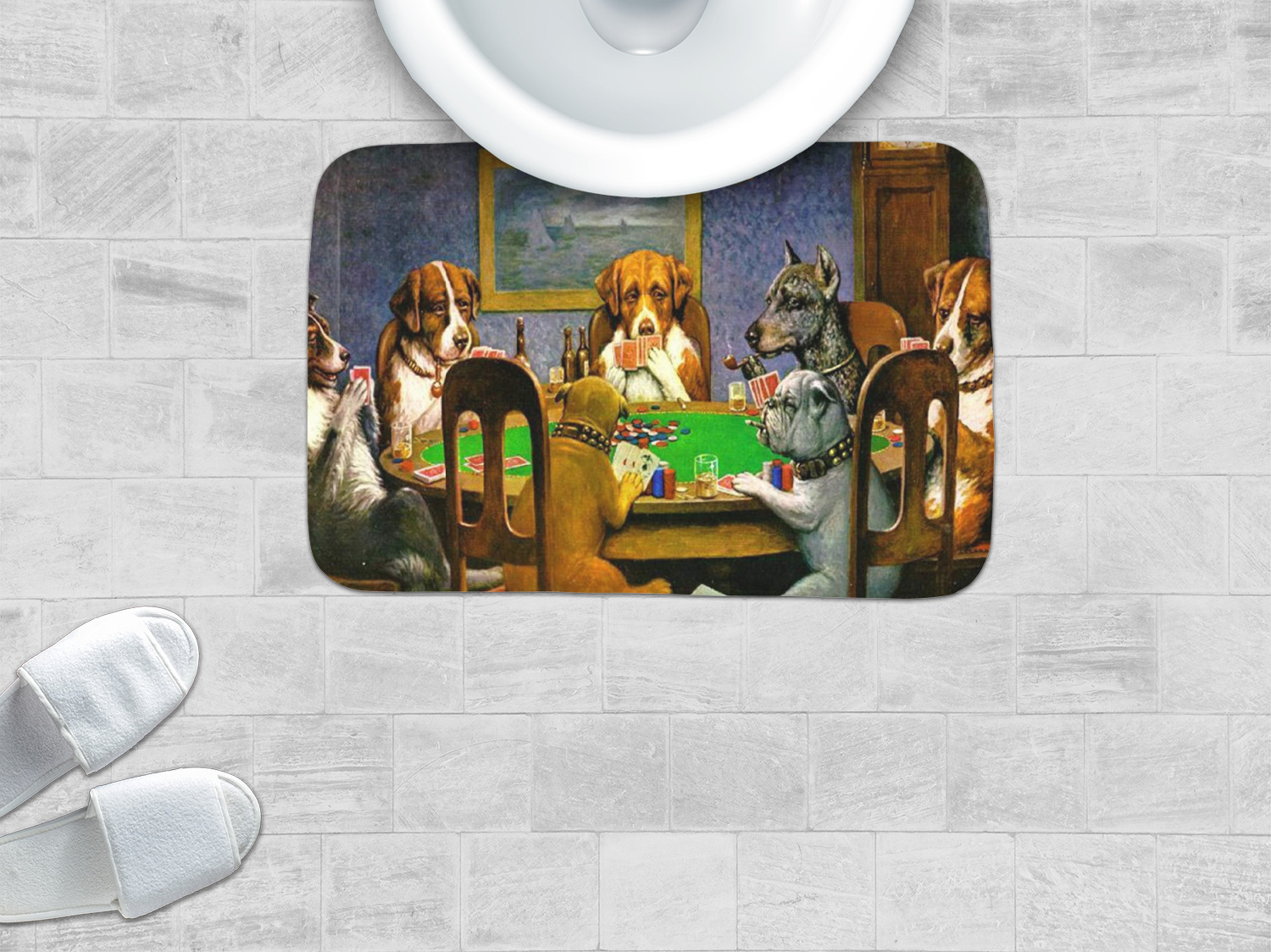 Dogs Playing Poker refers collectively to an 1894 painting, a series of sixteen oil paintings, and a 1910 painting by Cassius Marcellus Coolidge. Brown & Bigelow commissioned the 16 painting series in 1903 to advertise cigars. All eighteen paintings in the series feature personified dogs, but the eleven in which dogs are seated around a card table have become well known in the United States as examples of Kitsch art in home decoration. Source: Wikipedia