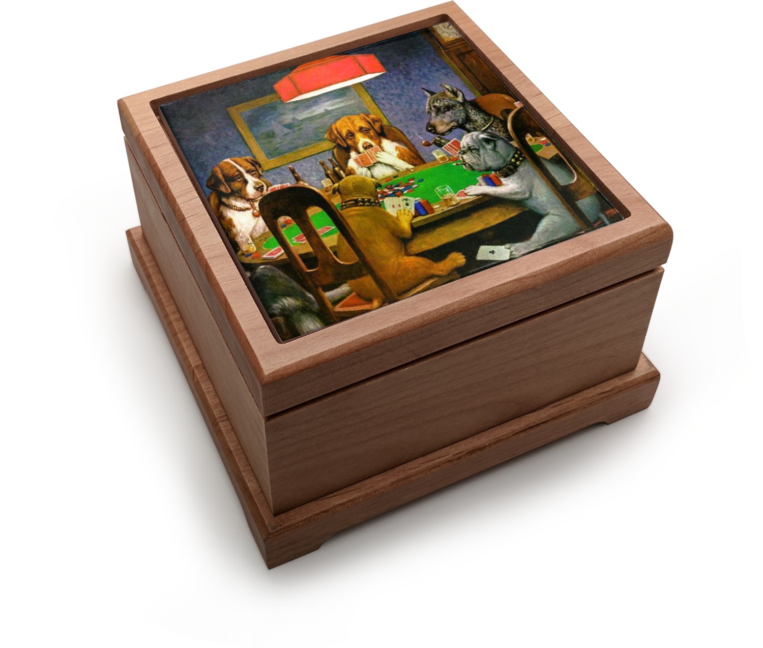 Dogs Playing Poker refers collectively to an 1894 painting, a series of sixteen oil paintings, and a 1910 painting by Cassius Marcellus Coolidge. Brown & Bigelow commissioned the 16 painting series in 1903 to advertise cigars. All eighteen paintings in the series feature personified dogs, but the eleven in which dogs are seated around a card table have become well known in the United States as examples of Kitsch art in home decoration. Source: Wikipedia