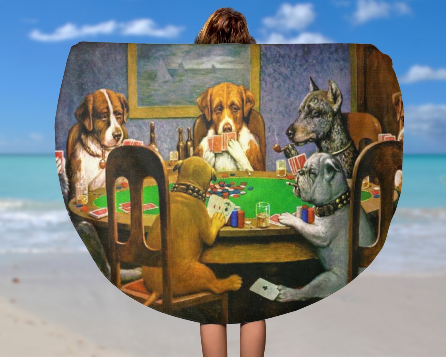 Dogs Playing Poker refers collectively to an 1894 painting, a series of sixteen oil paintings, and a 1910 painting by Cassius Marcellus Coolidge. Brown & Bigelow commissioned the 16 painting series in 1903 to advertise cigars. All eighteen paintings in the series feature personified dogs, but the eleven in which dogs are seated around a card table have become well known in the United States as examples of Kitsch art in home decoration. Source: Wikipedia